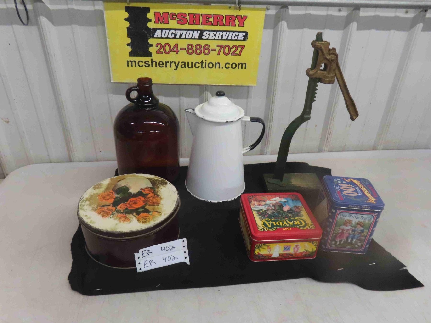 Enamel Kettle, Bottle Vaps, Glass Jug, Tins