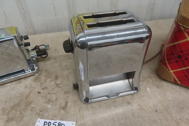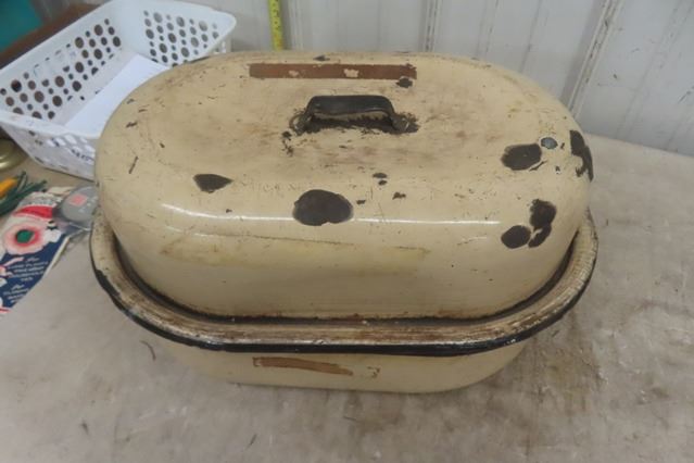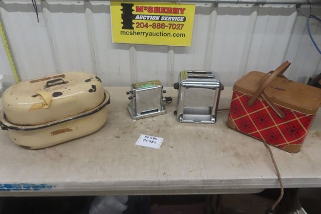 Enamel Roaster, 2 Vintage Chrome Toasters, Metal Picnic Basket