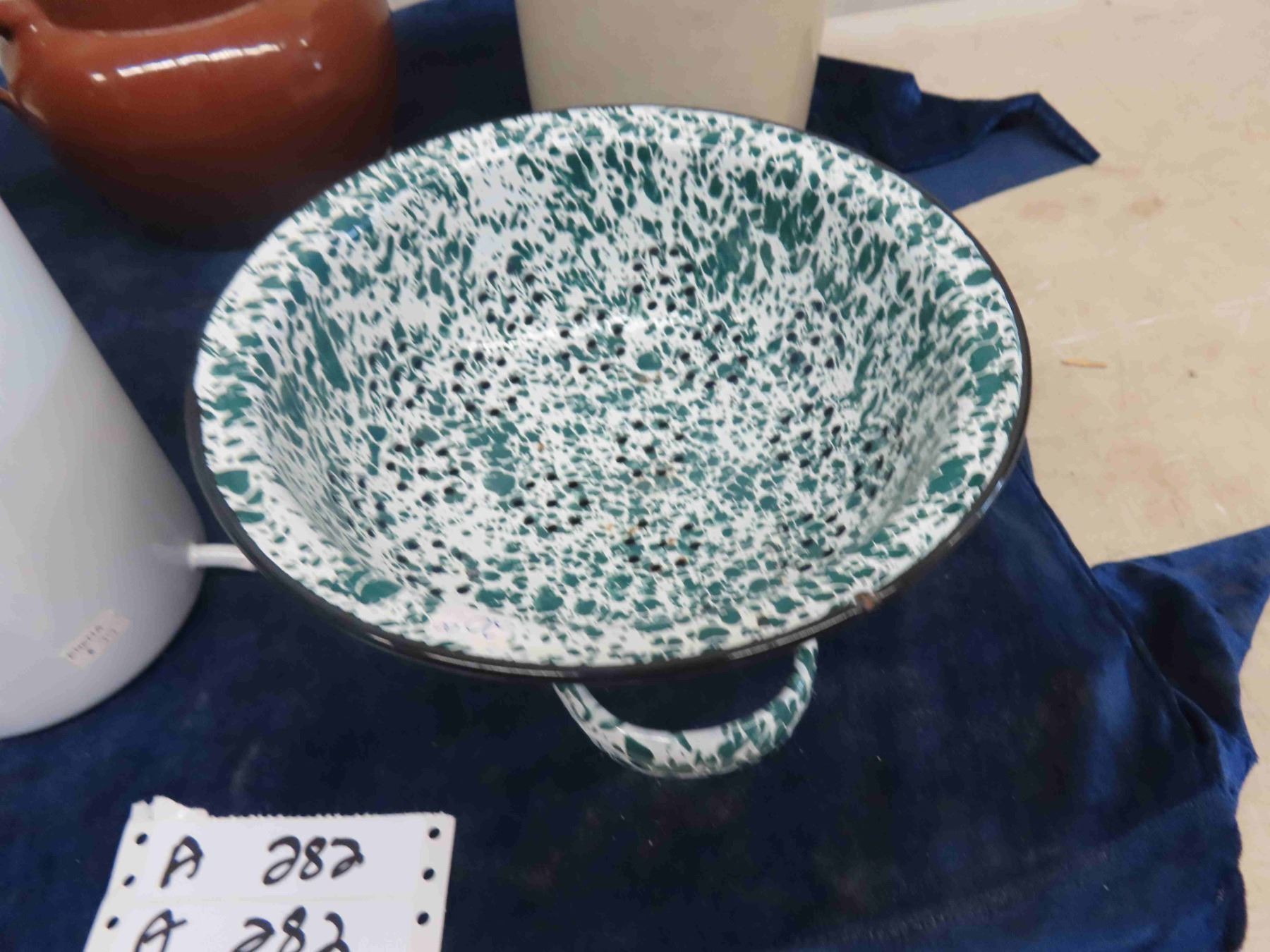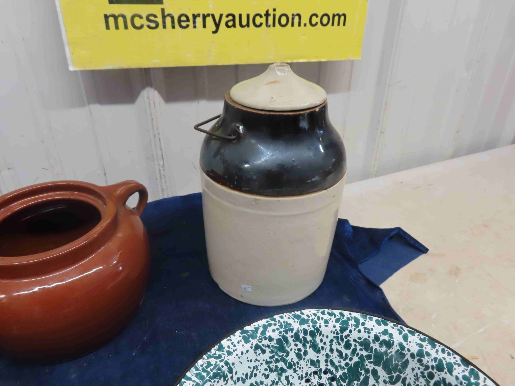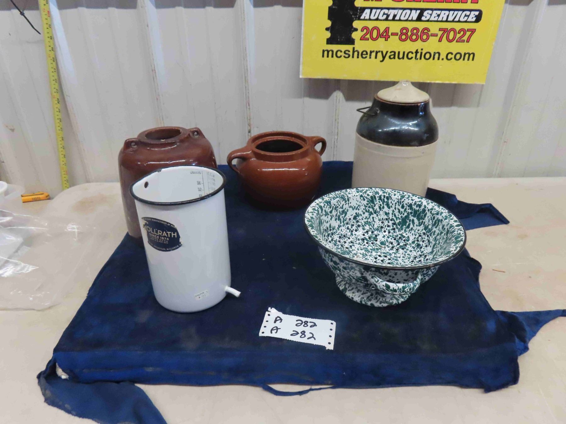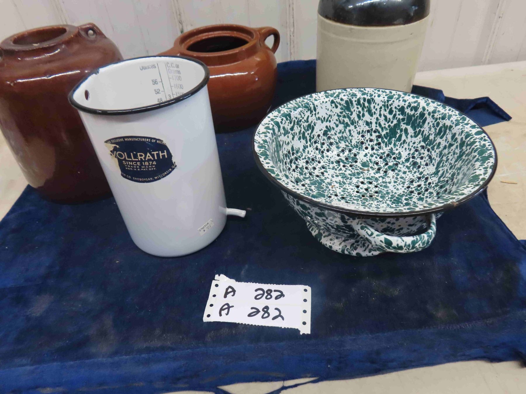 Enamel Strainer + Measurer, 3 Crockery Items ; Bean + Pickle Crocks