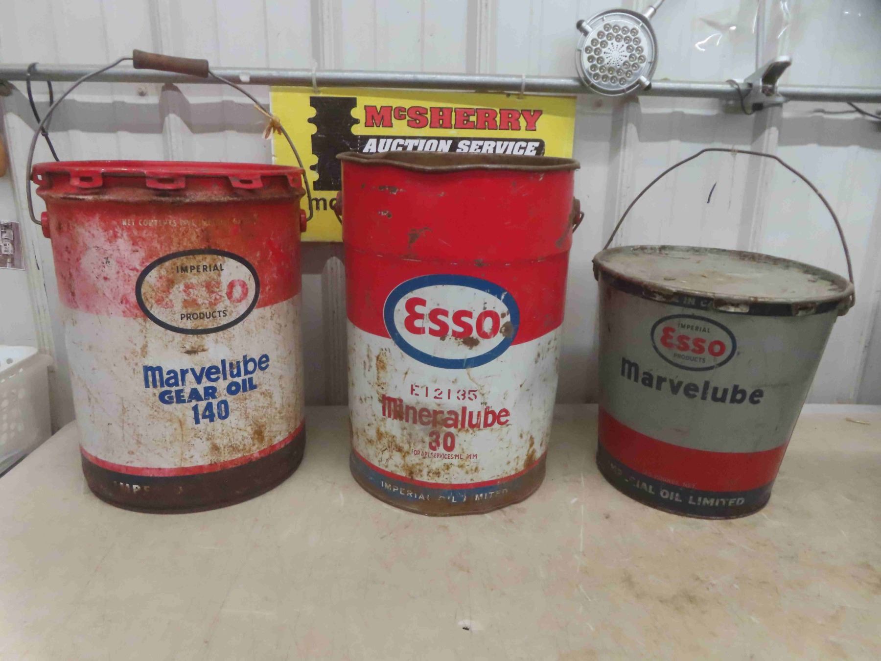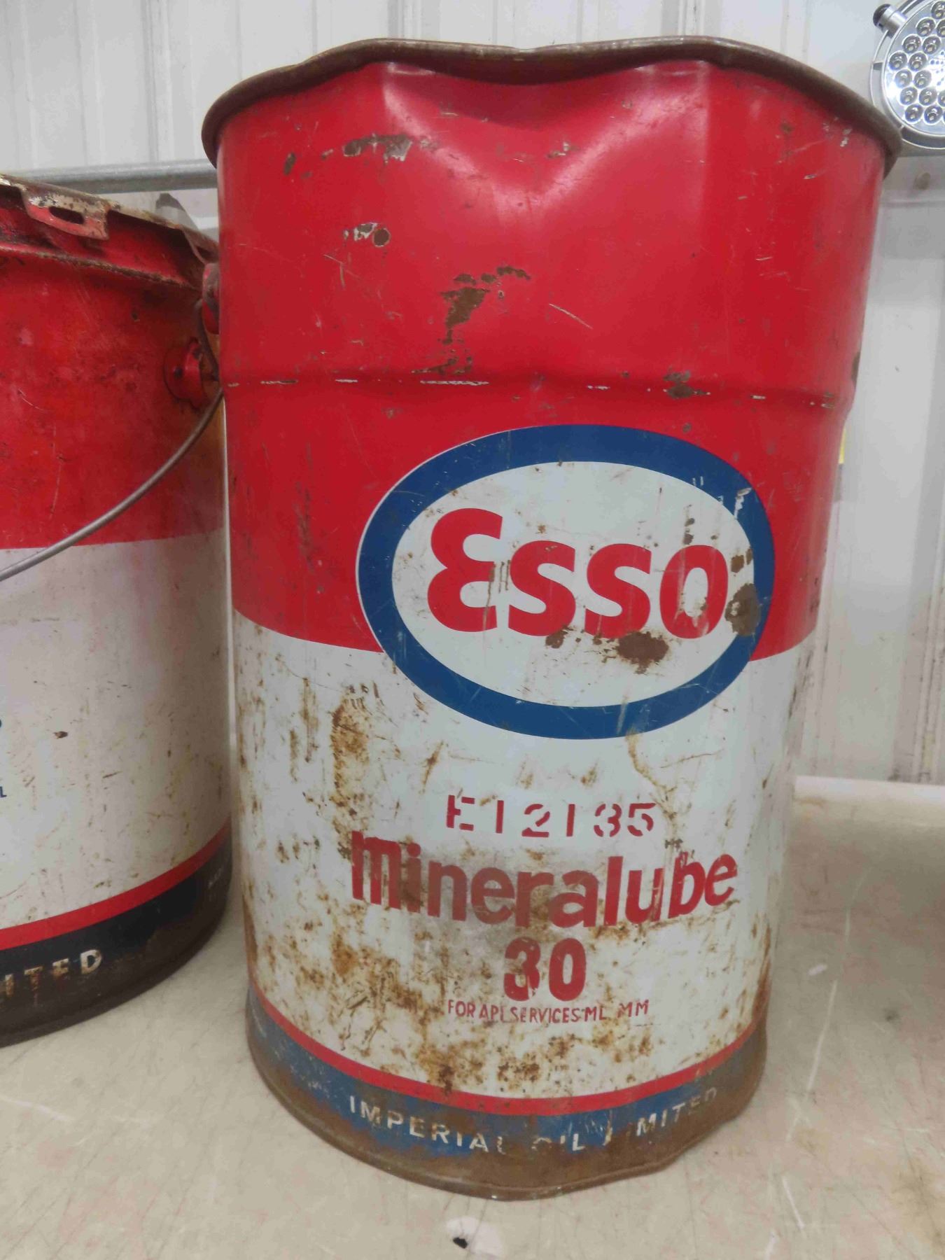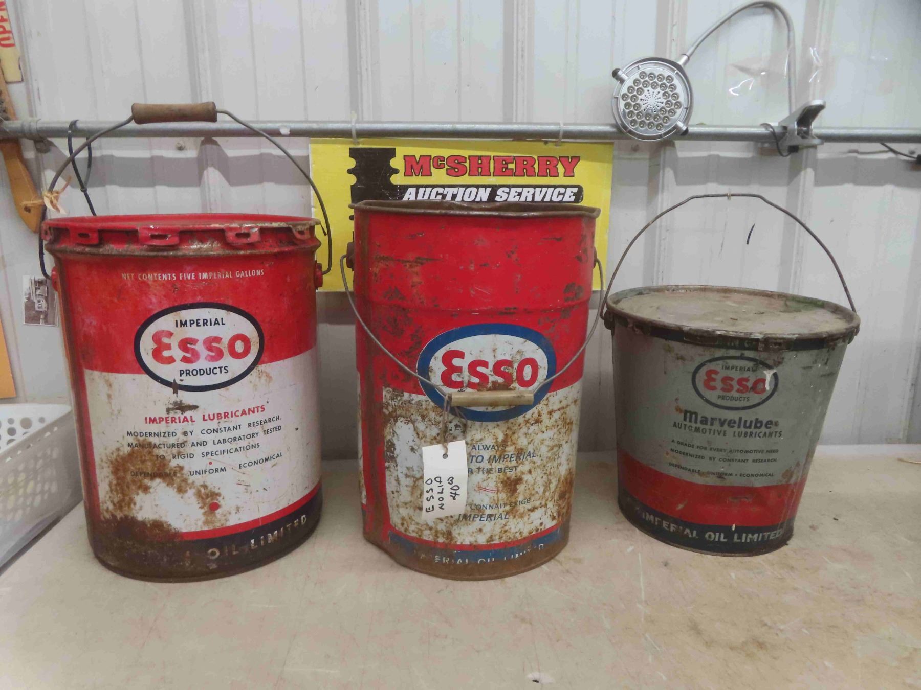 Esso 25lbs Grease Pail with Some Product, 2 Esso 5 Gallon Oil Pails (1 with Lid)