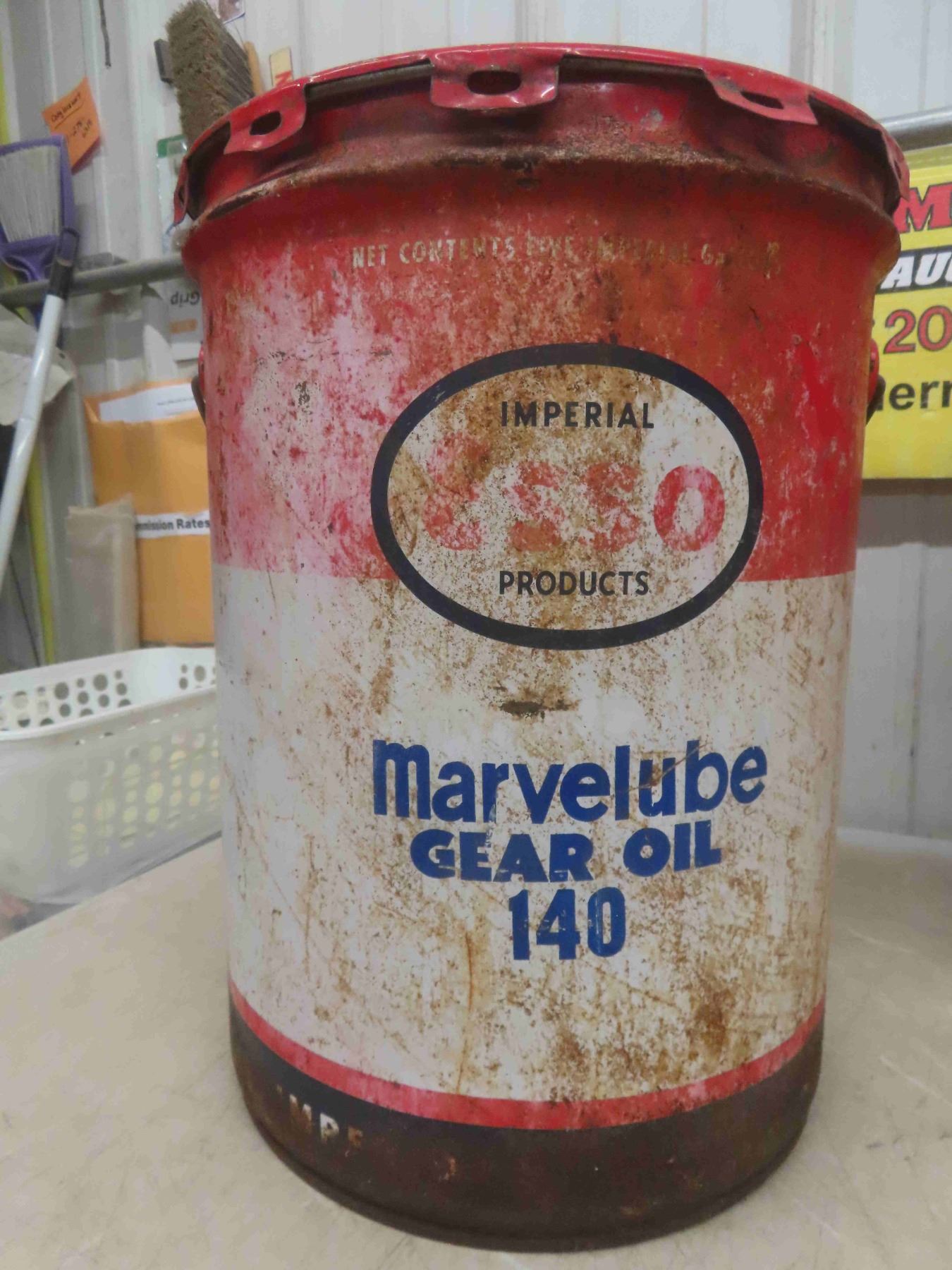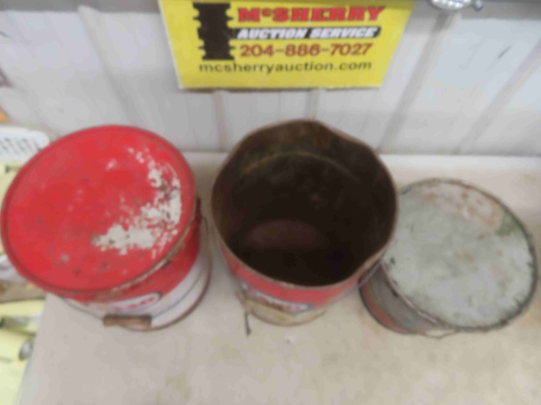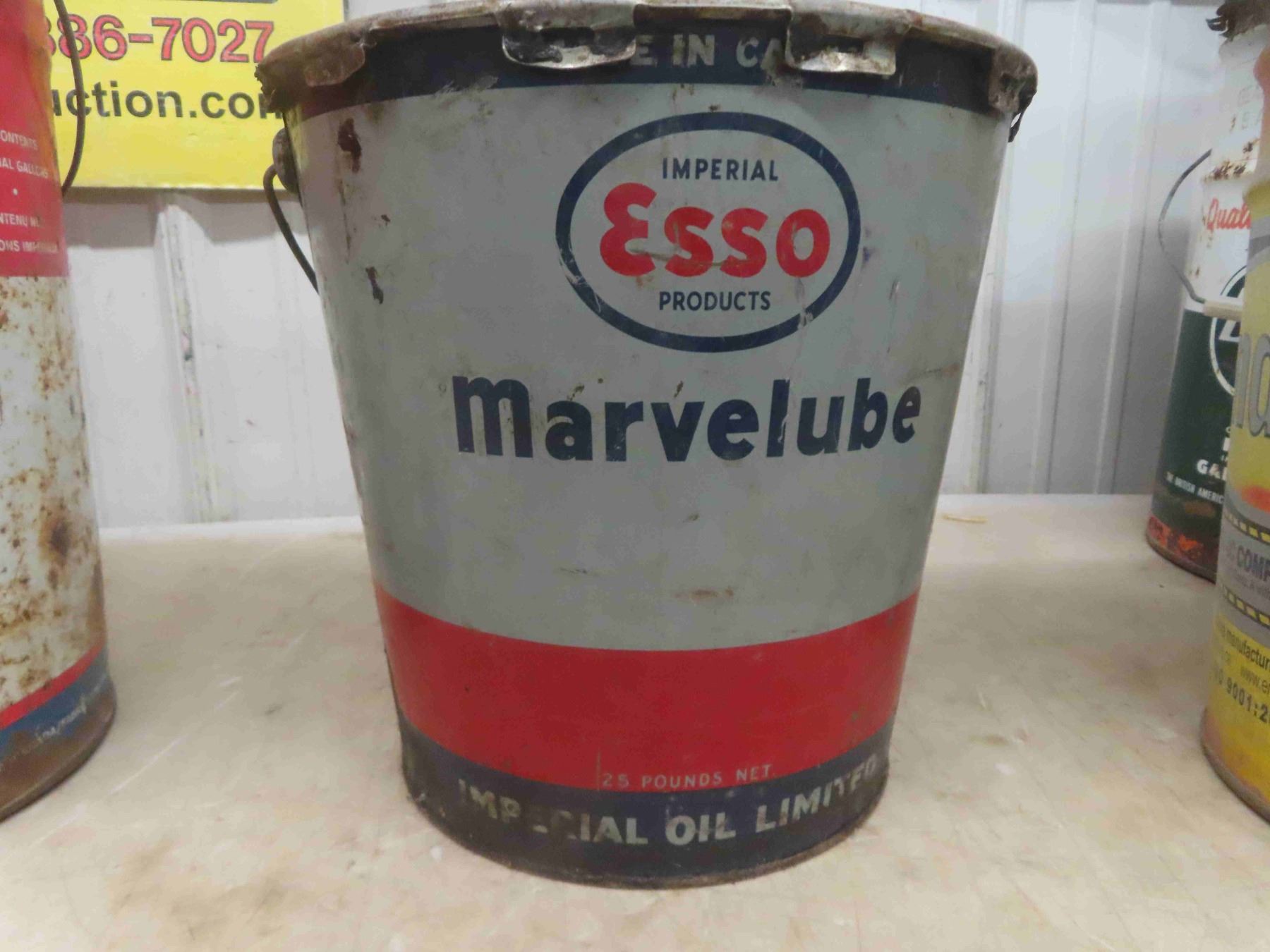 Esso 25lbs Grease Pail with Some Product, 2 Esso 5 Gallon Oil Pails (1 with Lid)