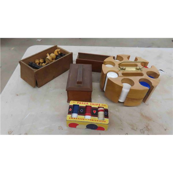 Vintage Poker Chip Caddy , Wood Chess Pieces, Box of Poker Chips
