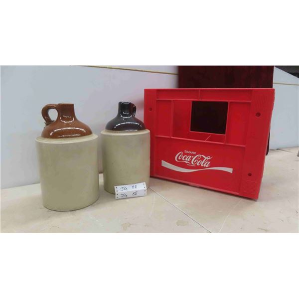 2 Vintage Stoneware Jugs with a Plastic Coca Cola Case