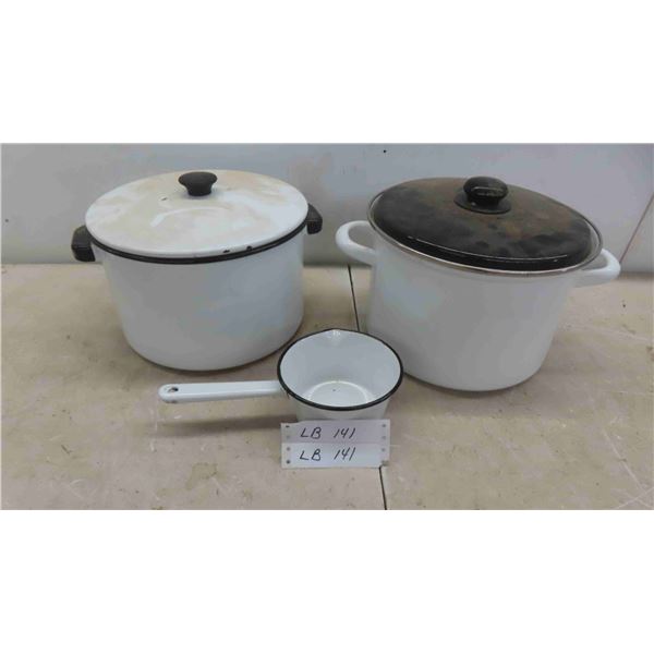 3 Enamel Pots & 2 Lids 141 - 3 Enamel Pots & 2 Lids