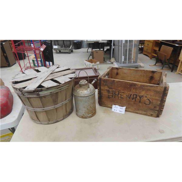 Bushel Basket with Lid , Drewrys Wood Crate 20'' x 12'' x 10 1/2'' , Vintage Oil Can