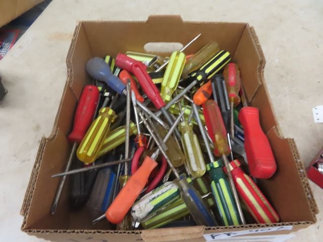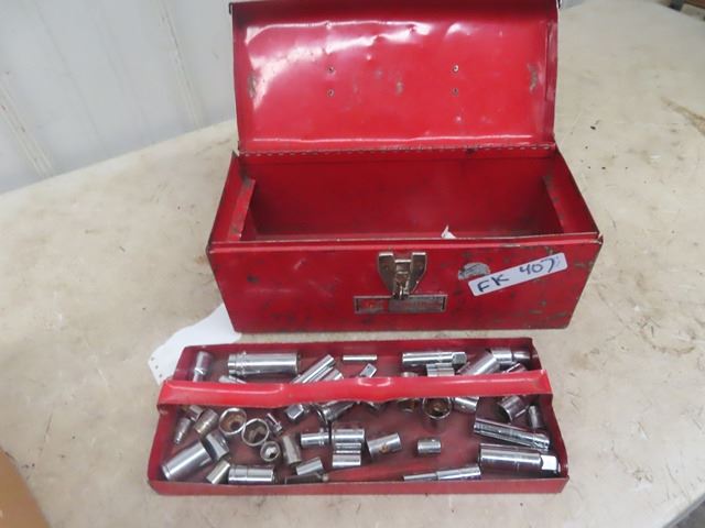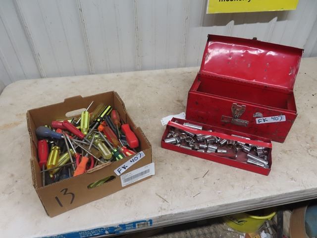 (FK) Screwdrivers, 1/2", 3/8 Sockets & Metal Tool Box