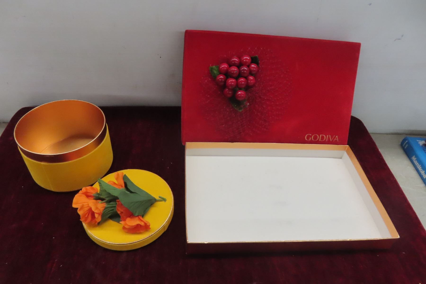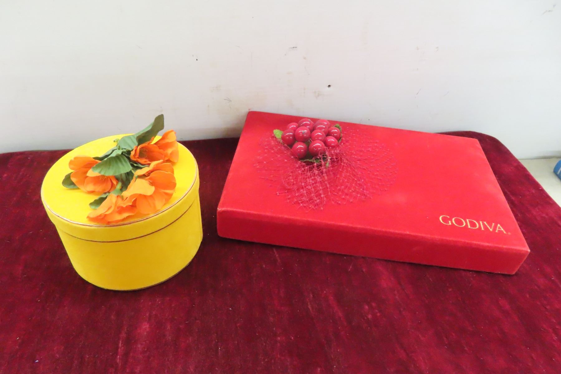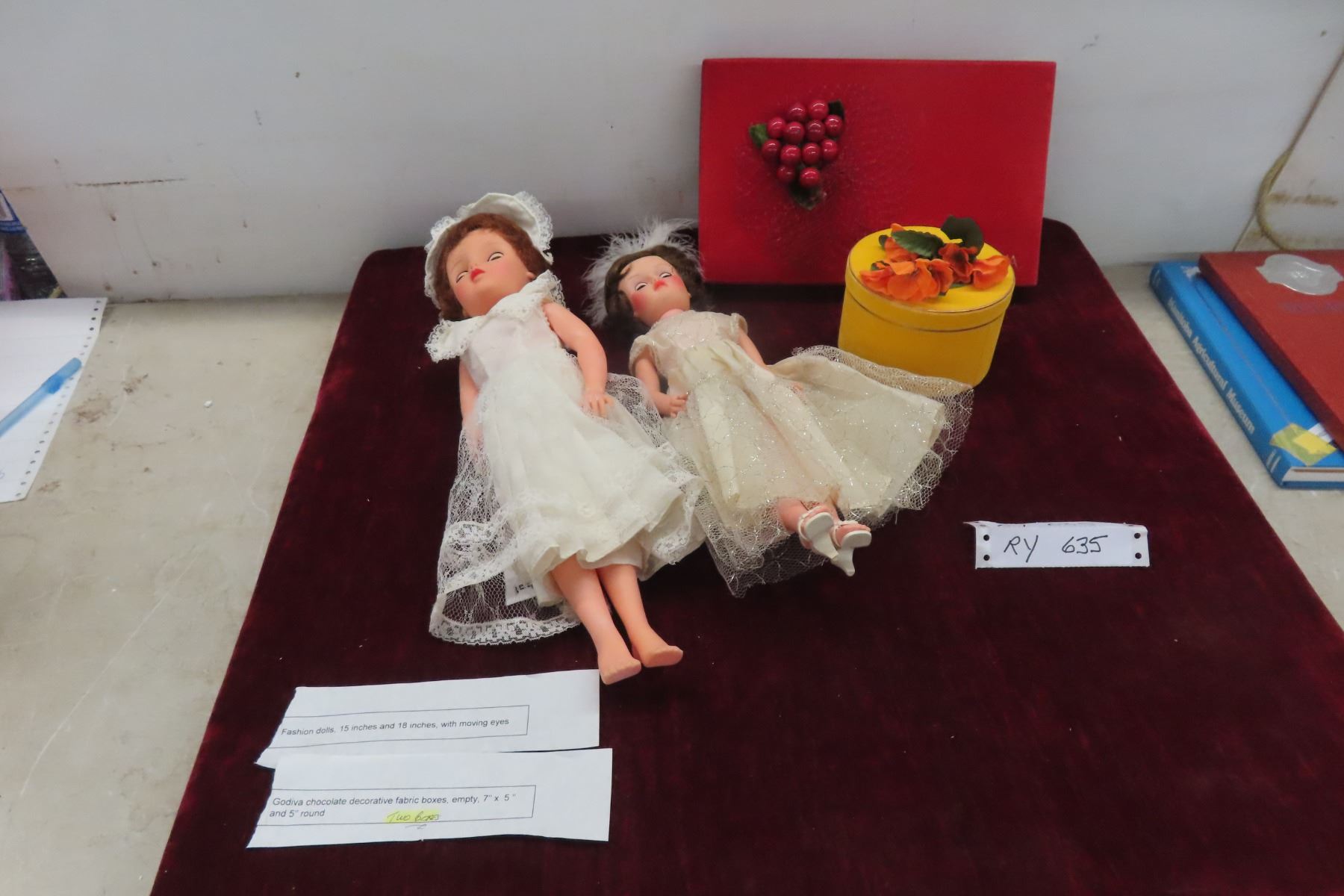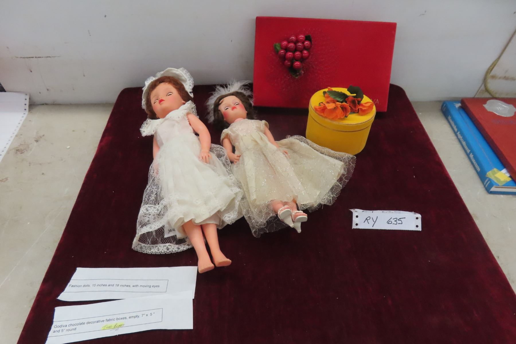 Fashion Dolls with Moving Eyes 15 + 18" Tall, 2 Godiva Chocolate Decorative Fabric Boxes
