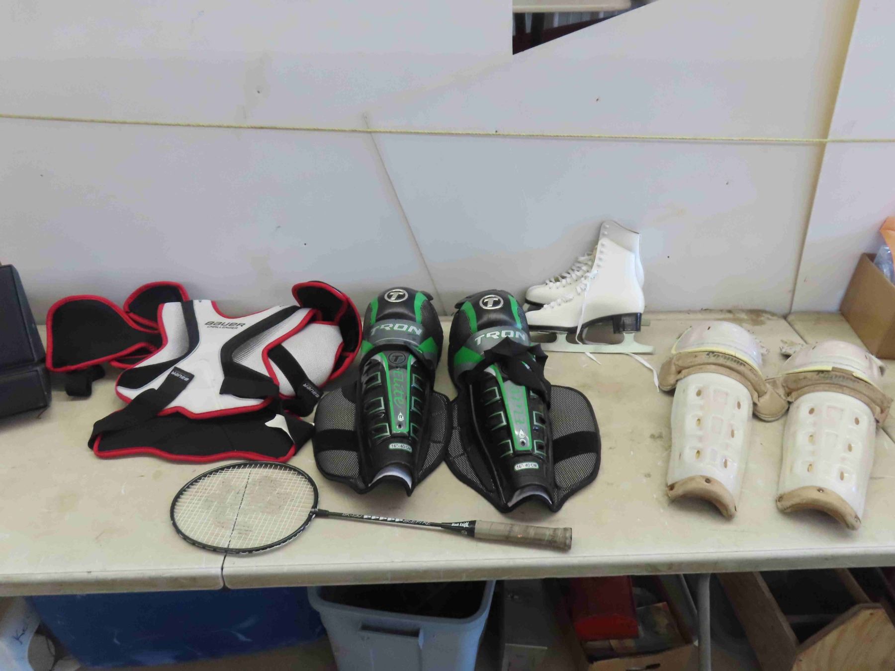 Figure Skates Size 9 , 2 Sets of Shin Pads , Chest Protector Size Medium , 2 Badminton Rackets