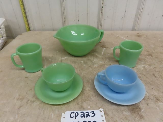 Fire King Jadeite Pitcher, 2 Coffee Mugs, Tea Cup + Saucer, Blue Delphite Tea Cup + Saucer