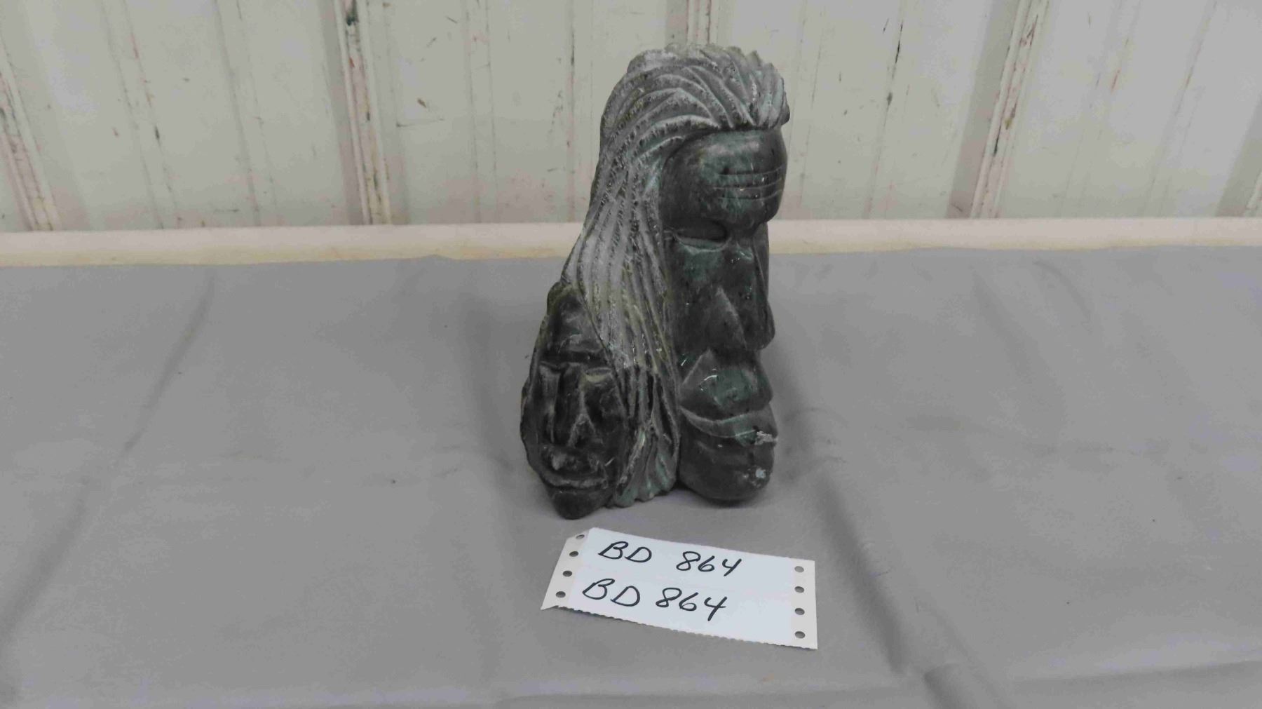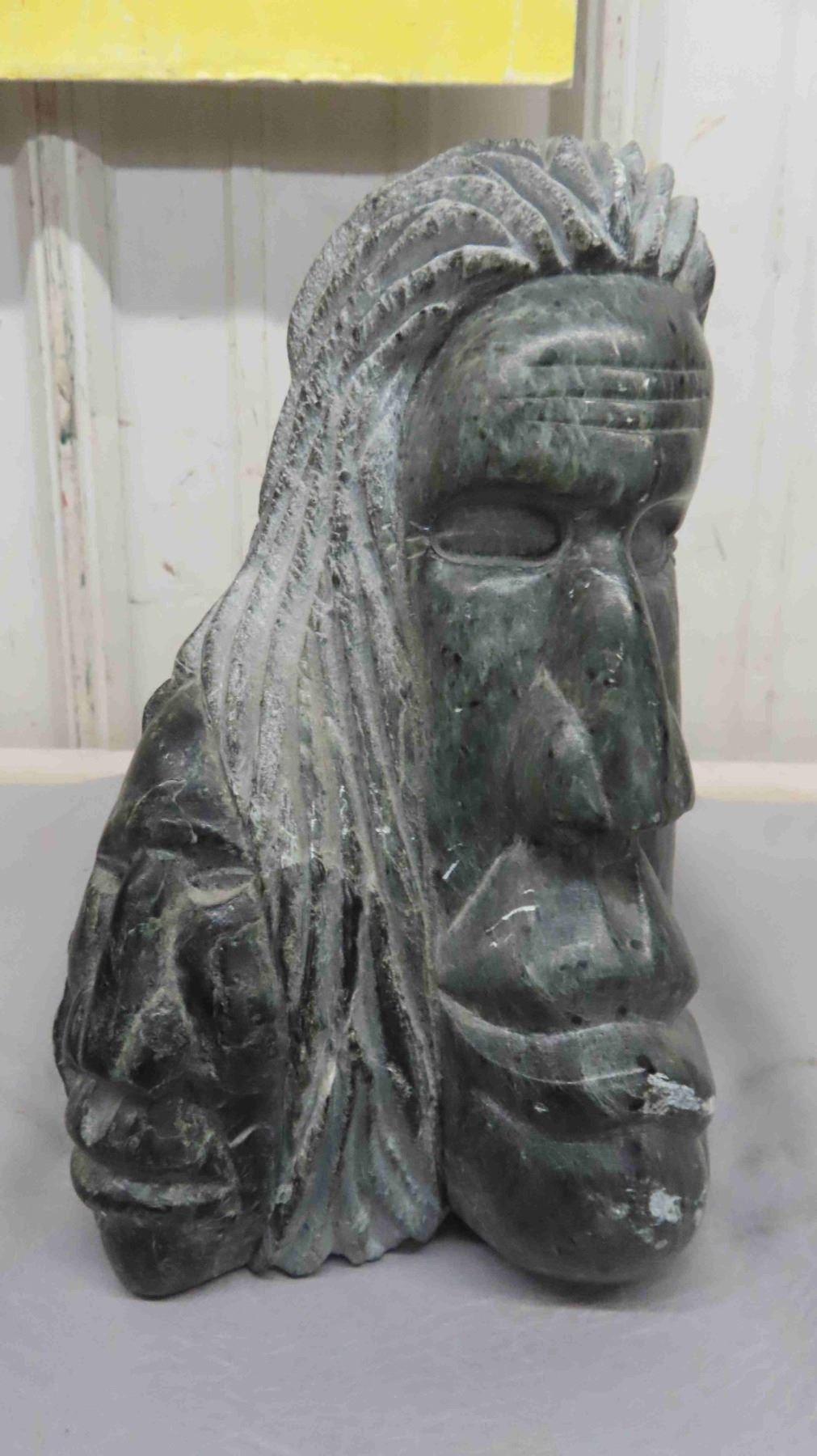 First Nations 2 Face Spirit Soapstone Carving by Stillwell 1998 - Heavy! 7.5" Tall
