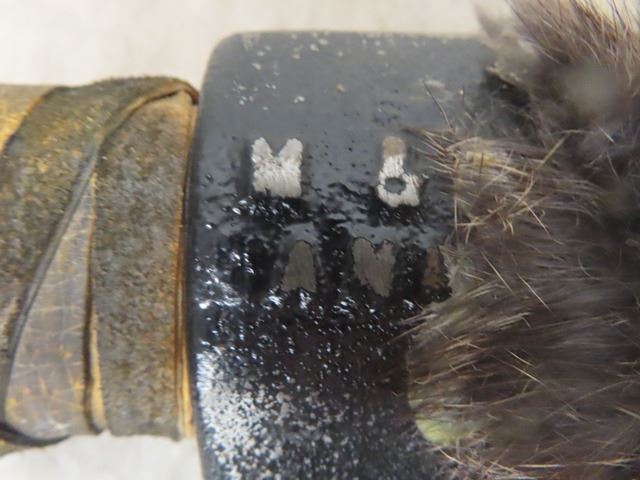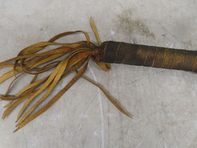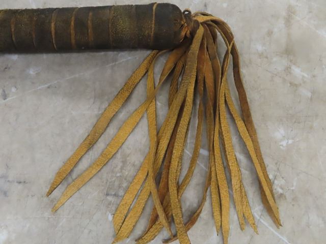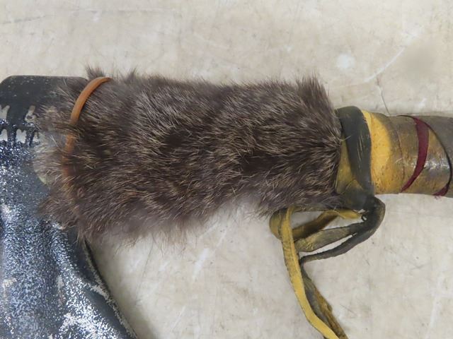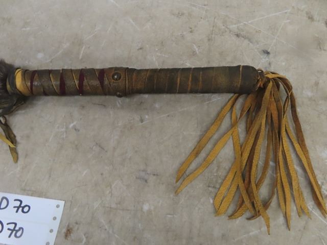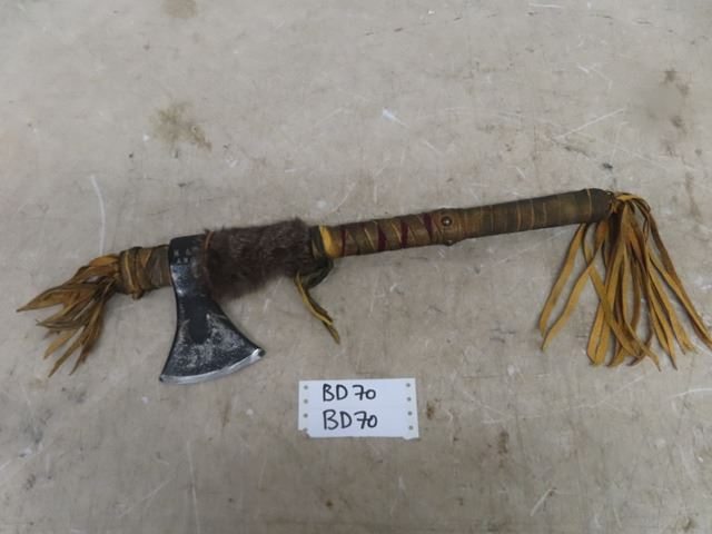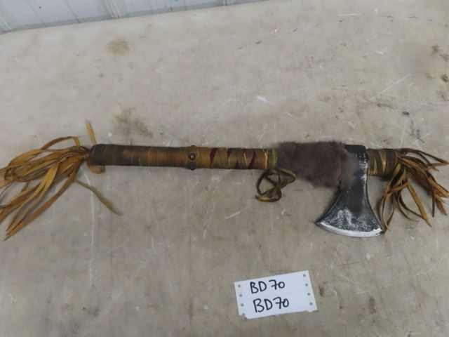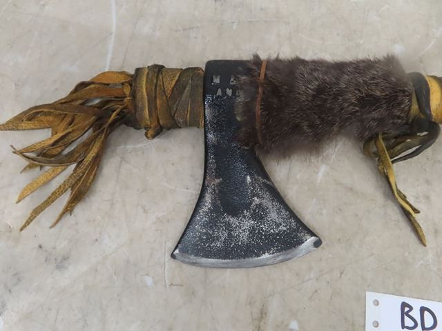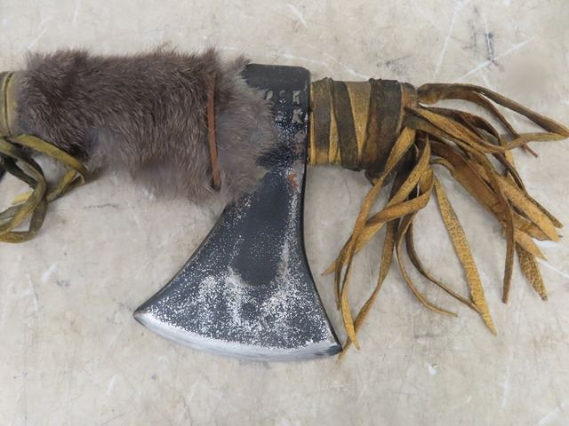 First Nations Tomahawk With Iron Axe Head + Wooden Handle Decorated with Rawhide Wrapping + Tassles, Fur + Metal Tacks 21" Long