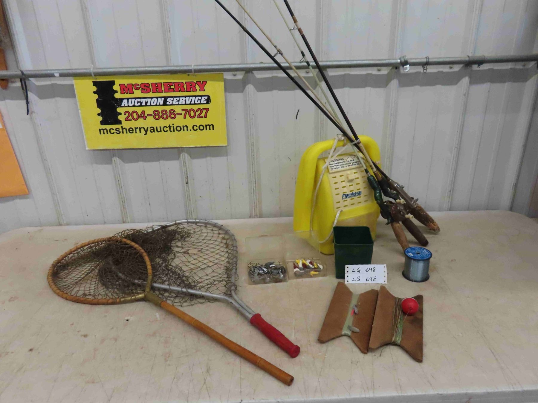 Fishing Package: 4 Rods, 1 Reel , 2 Nets (1 Vintage) , Minnow Keeper, Sinkers, Hooks, Line & More