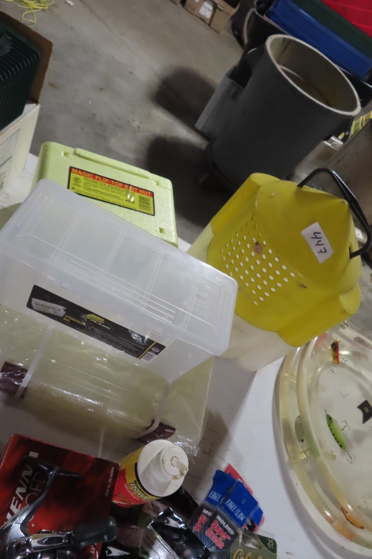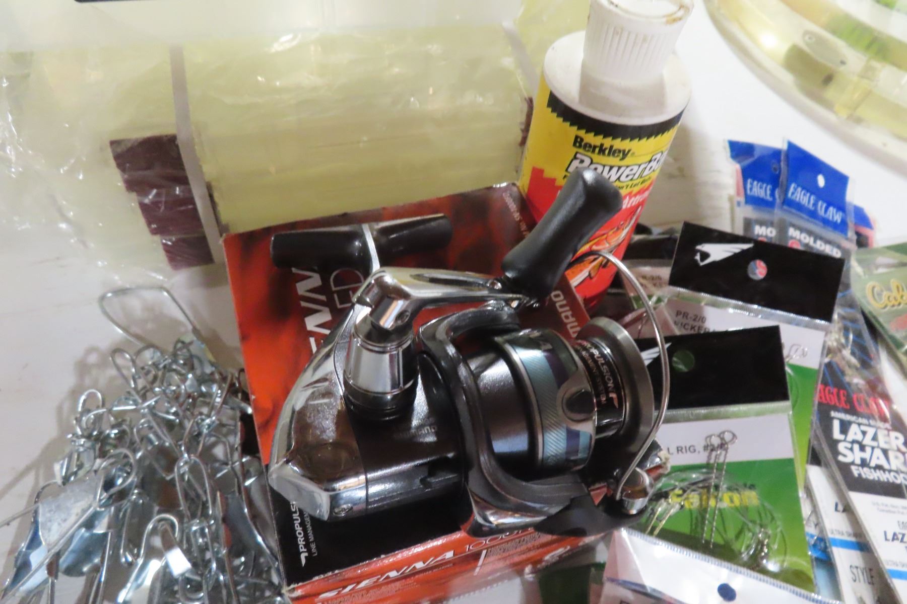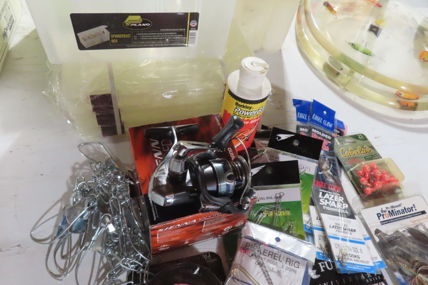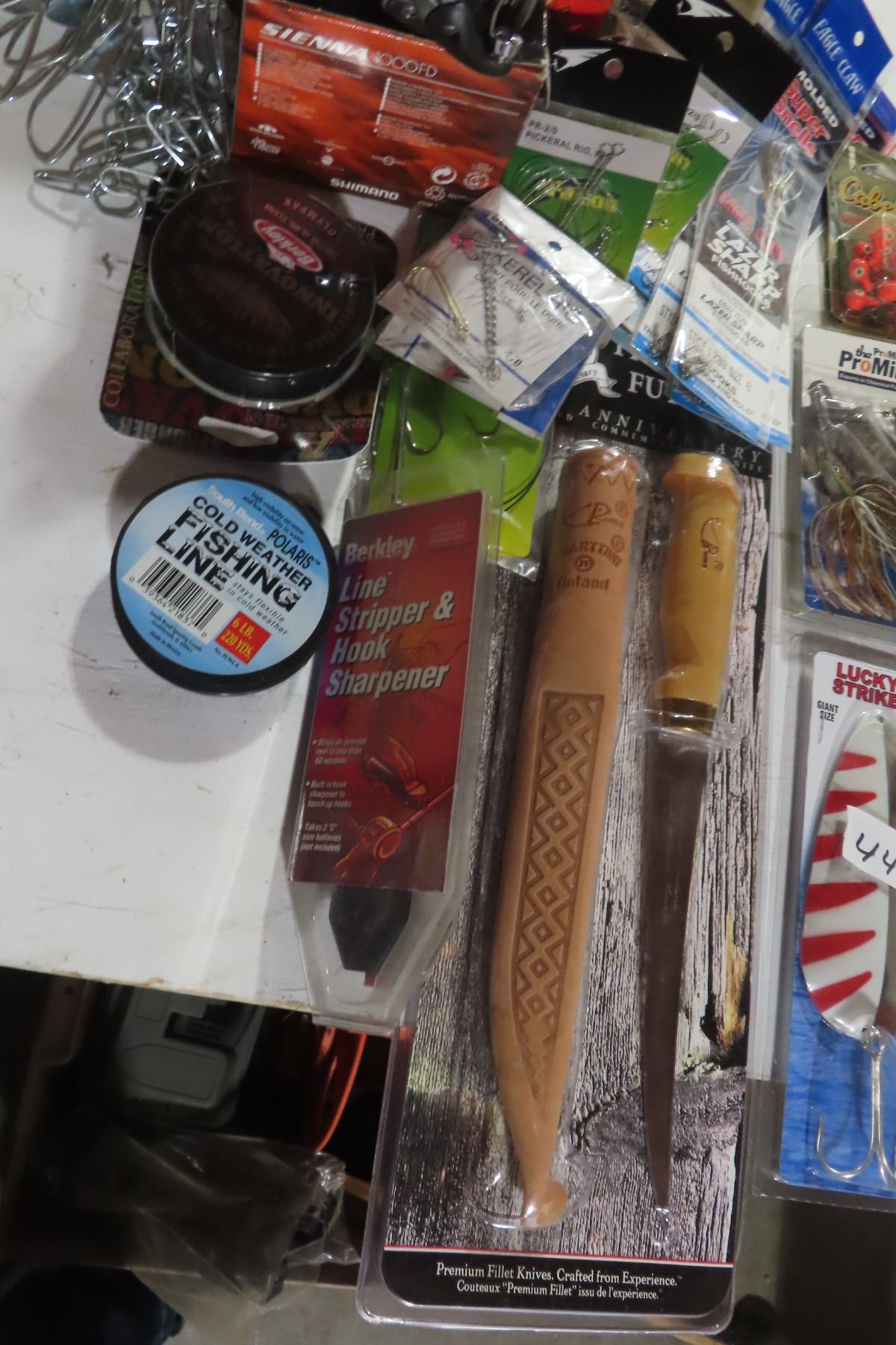 Fishing: Reel, Line, Stripper, Hook Sharpener,Pickeral Rigs. Hooks, Filet Knife, Bait Containers +