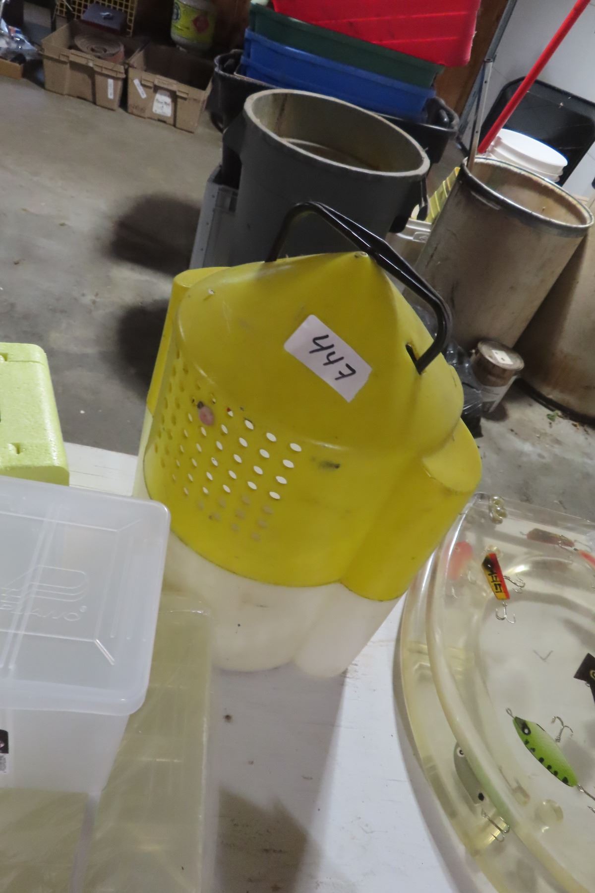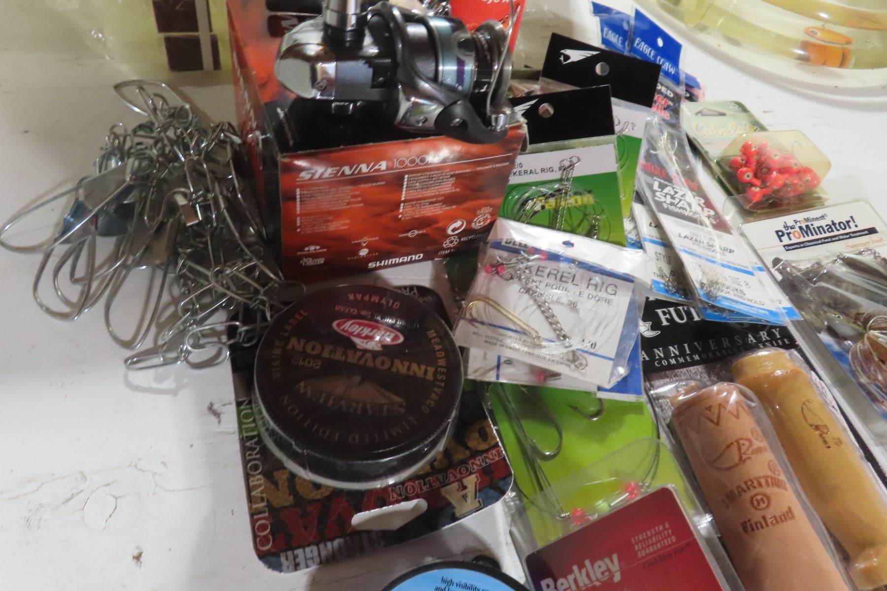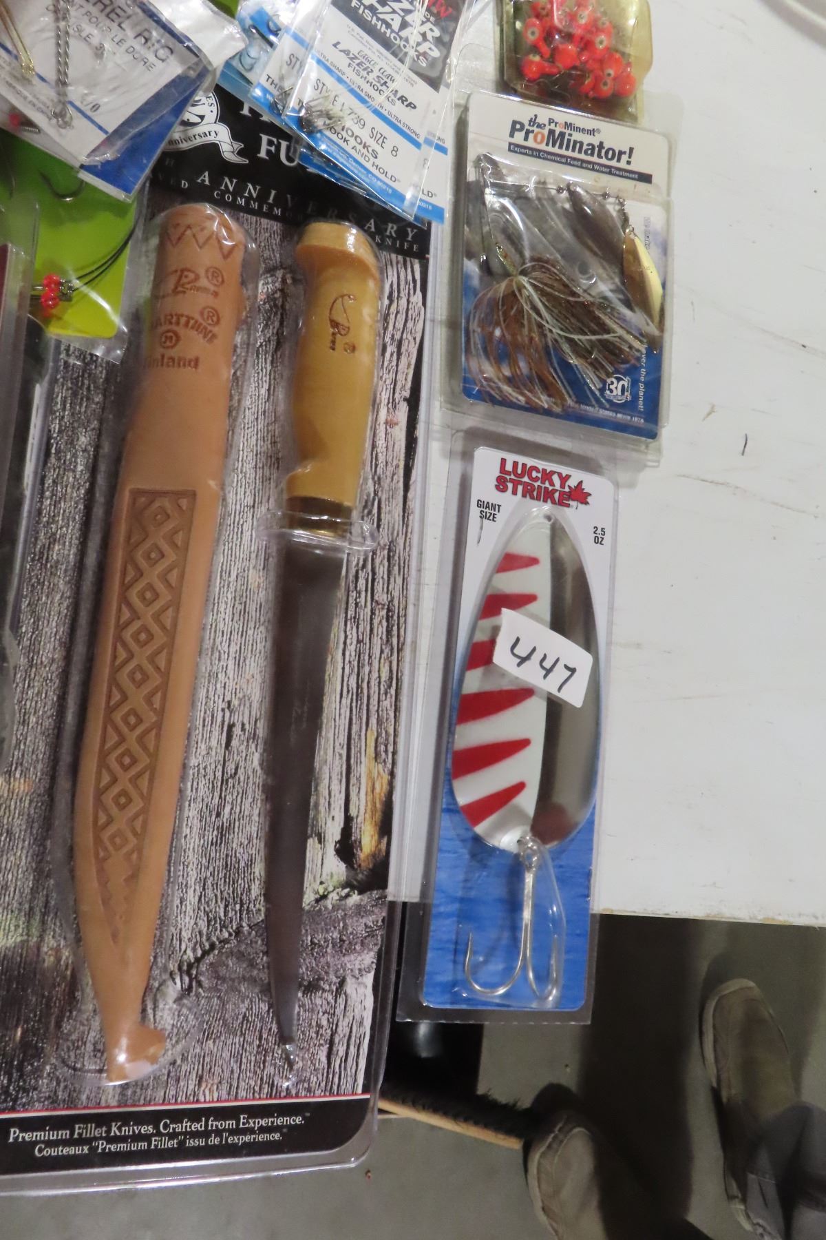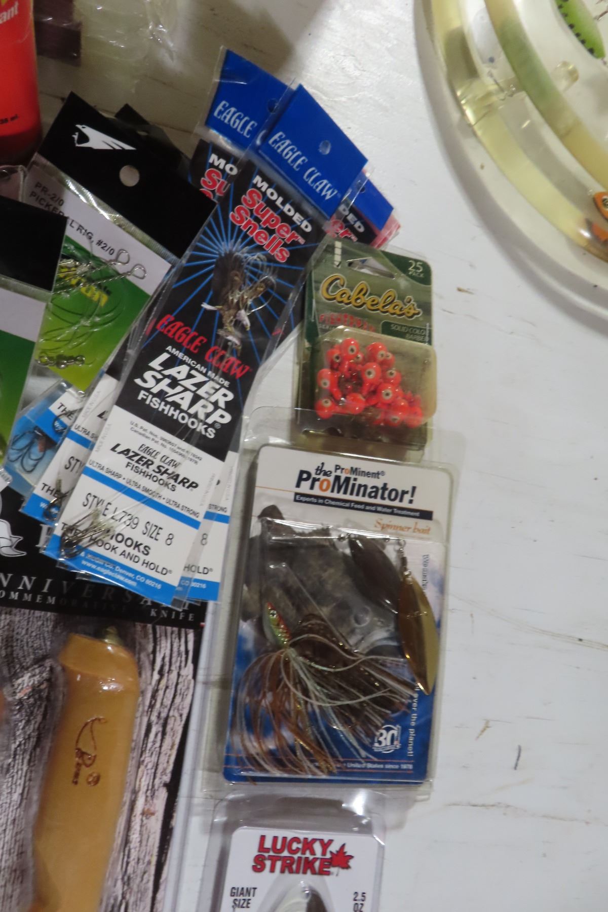 Fishing: Reel, Line, Stripper, Hook Sharpener,Pickeral Rigs. Hooks, Filet Knife, Bait Containers +