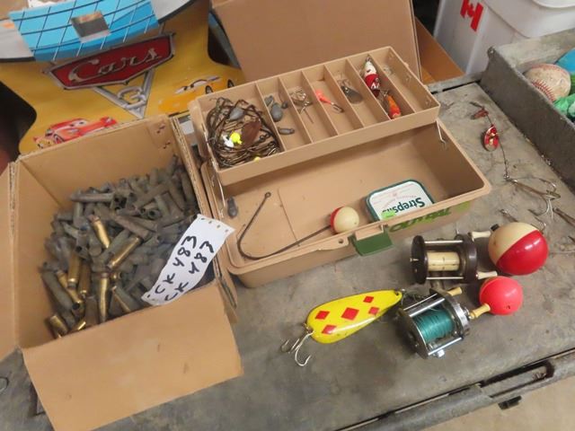 Fishing Tackle Box, Reel + Hooks & 300 Cal Brass Casings