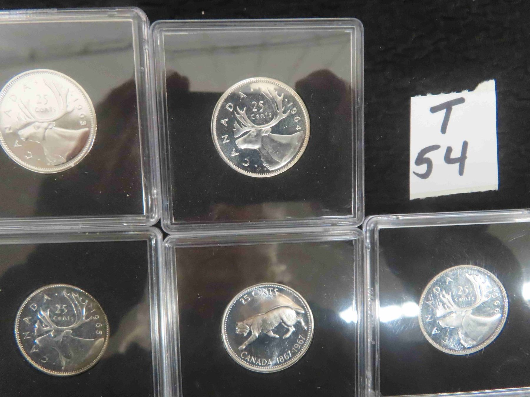 Five: Canadian 80% Silver 25 cent pieces; 1963, 1964, 1965, 1966, and 1967; all 5 coins are
