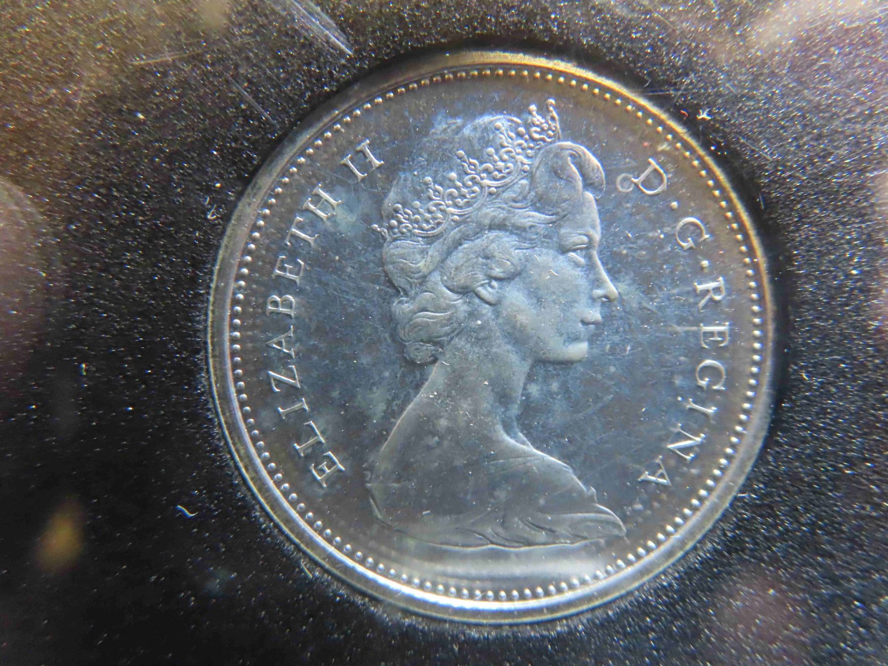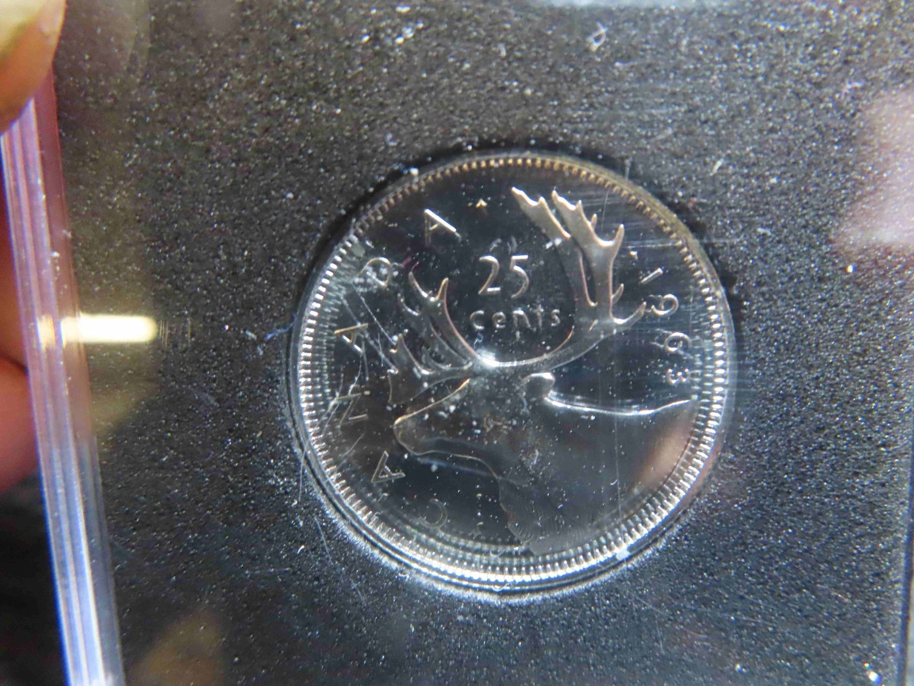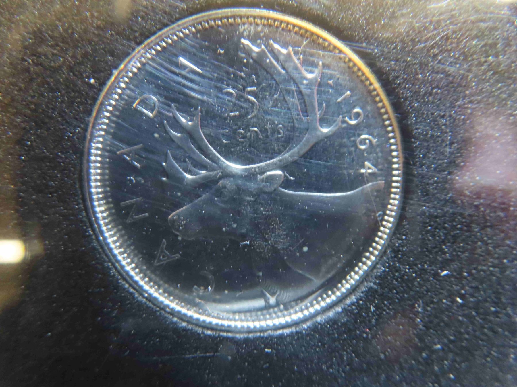Five: Canadian 80% Silver 25 cent pieces; 1963, 1964, 1965, 1966, and 1967; all 5 coins are sealed in cases, they are untouched by any human hand, they are of the highest BU-PL-MS++ quality; unfortunately I am not a professional grader.