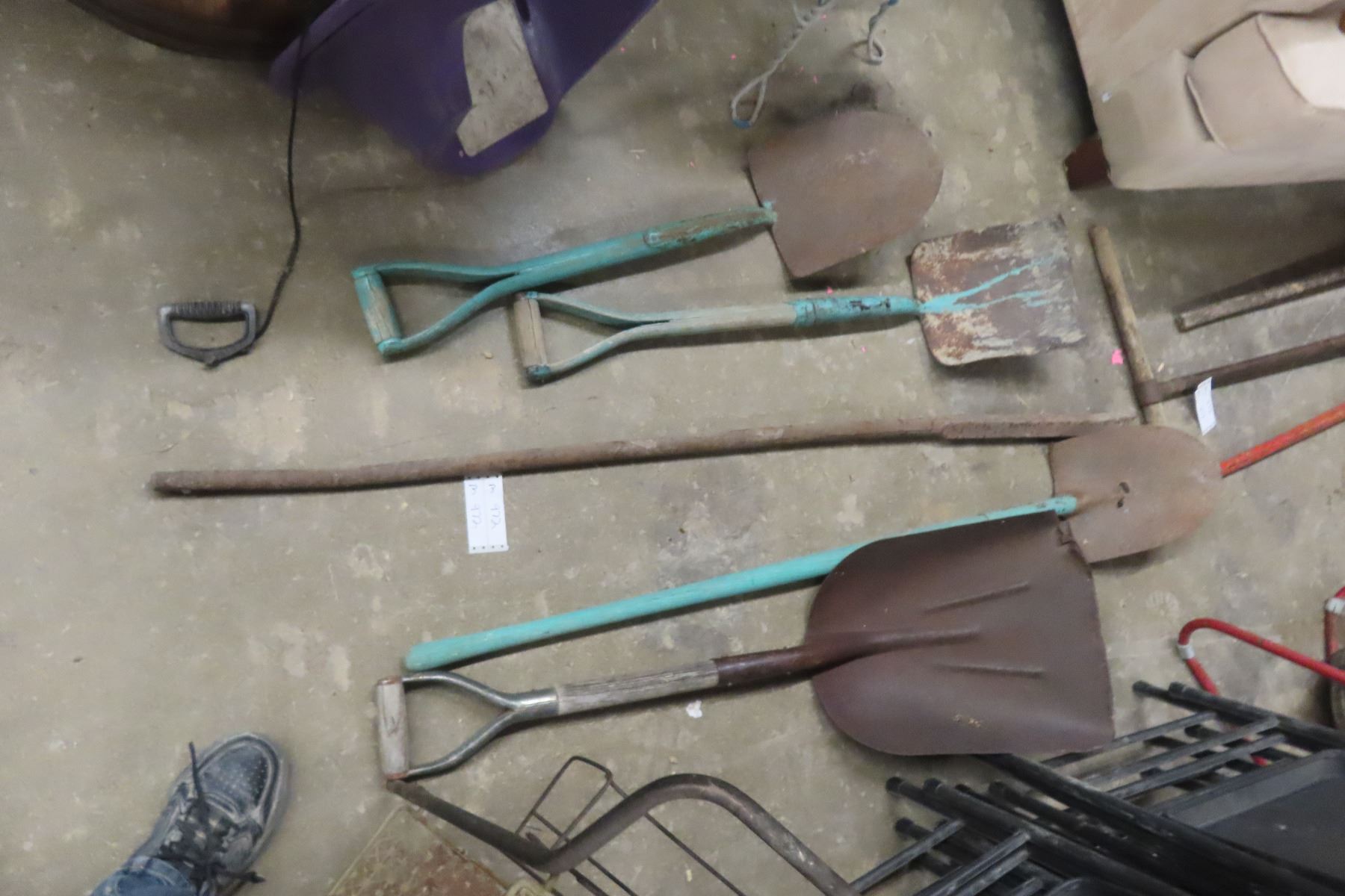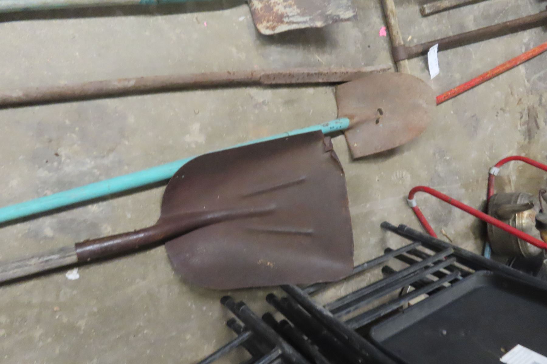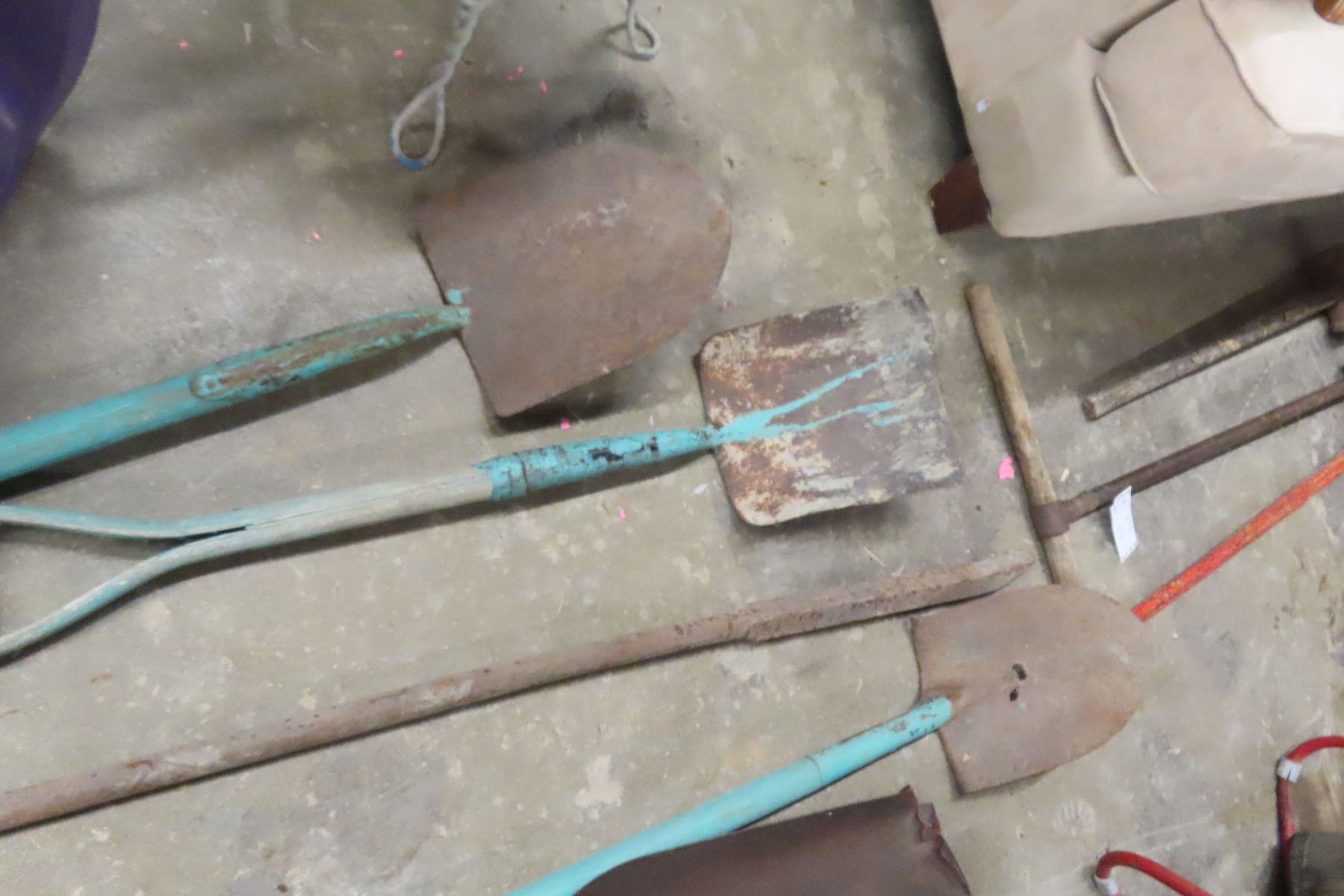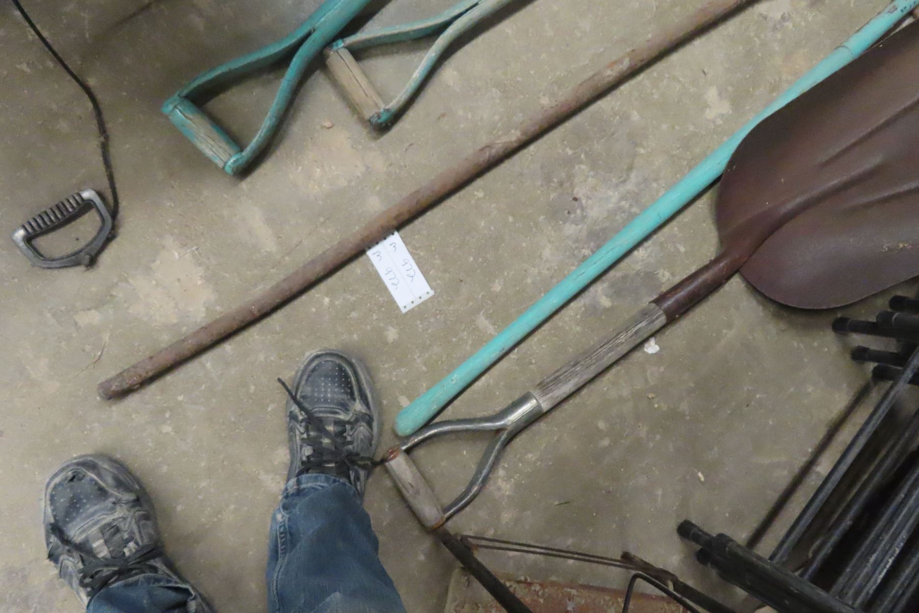Five Hand Yard Tools Including Garden Bar, Shovels, and Spade