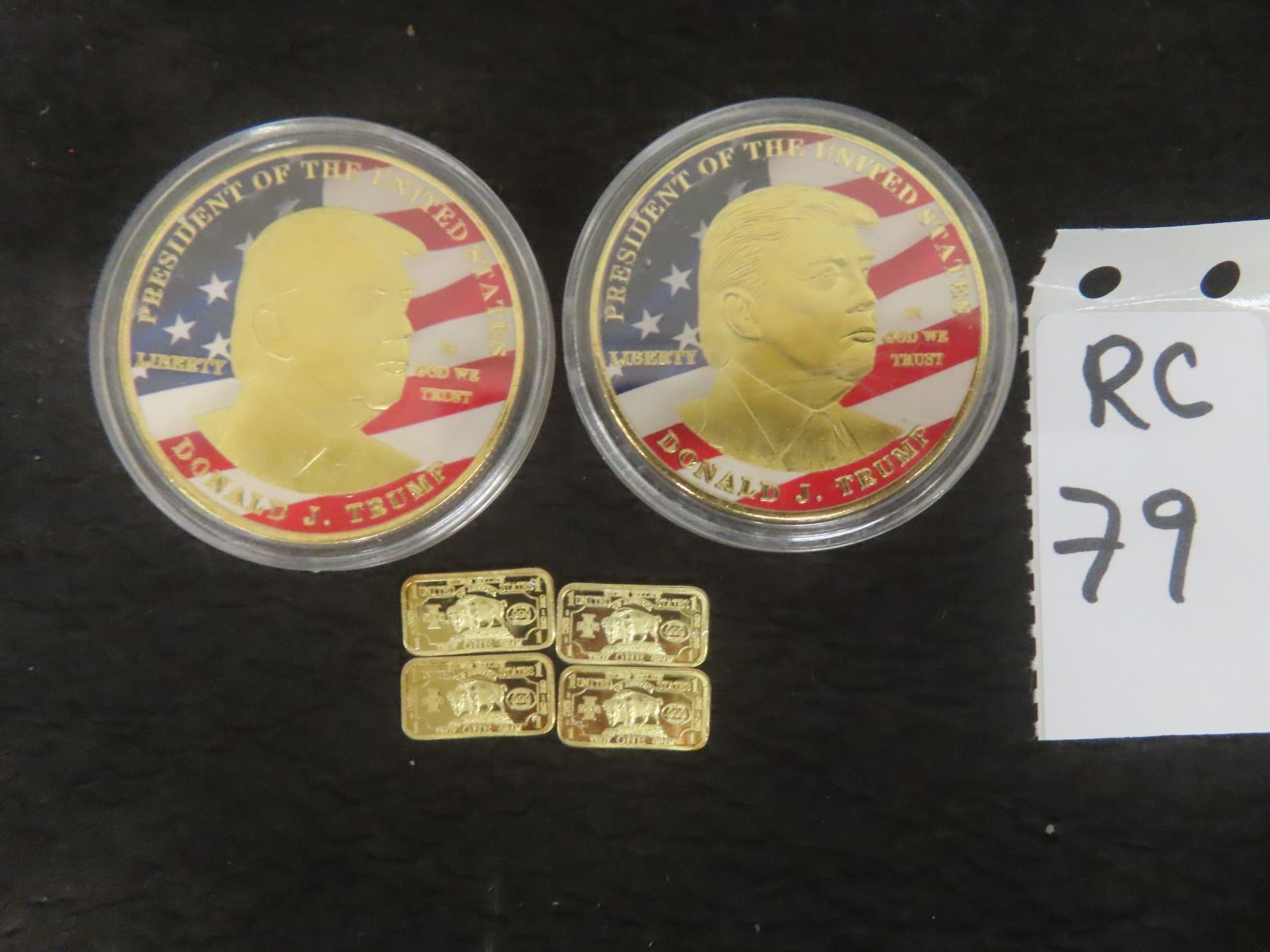 Four Small Gold-Plated Ingots and Two Donald Trump Coins