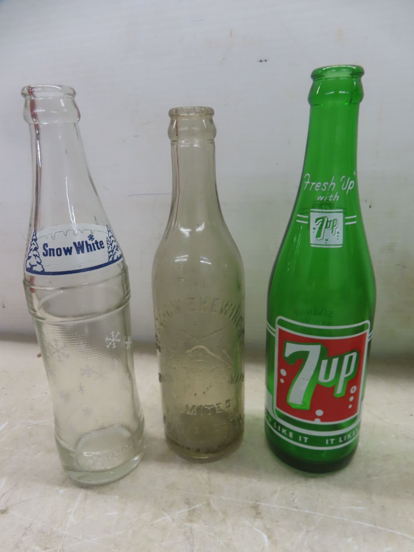 Fourteen Vintage Bottles (7-Up, Coke, Plains City, Wynol, Snow White, Keystone Ginger Ale) with Product