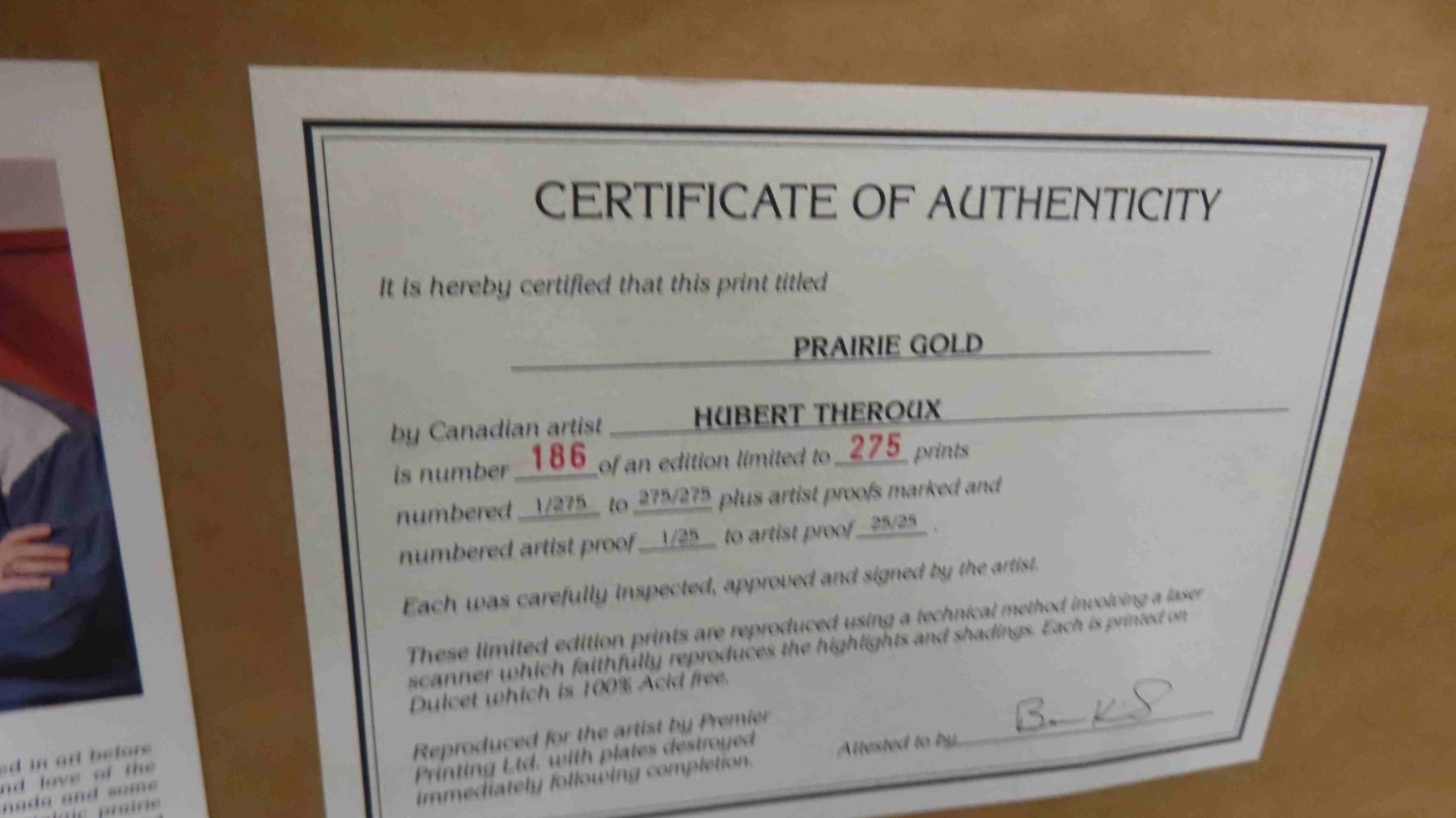 Frame print 186/275 Prairie Gold Signed By Hubert Theroux South of Swan River 22" x 28"