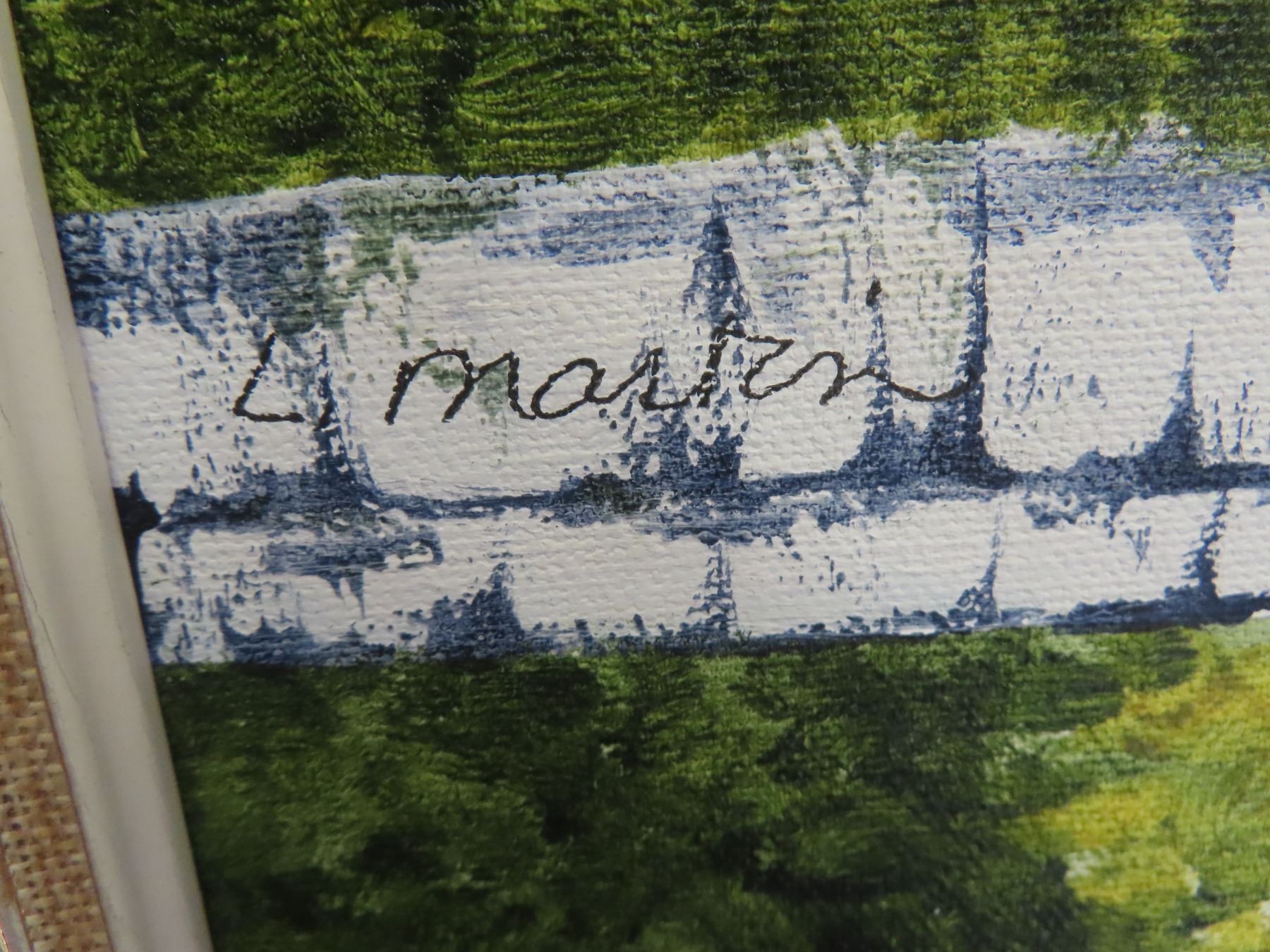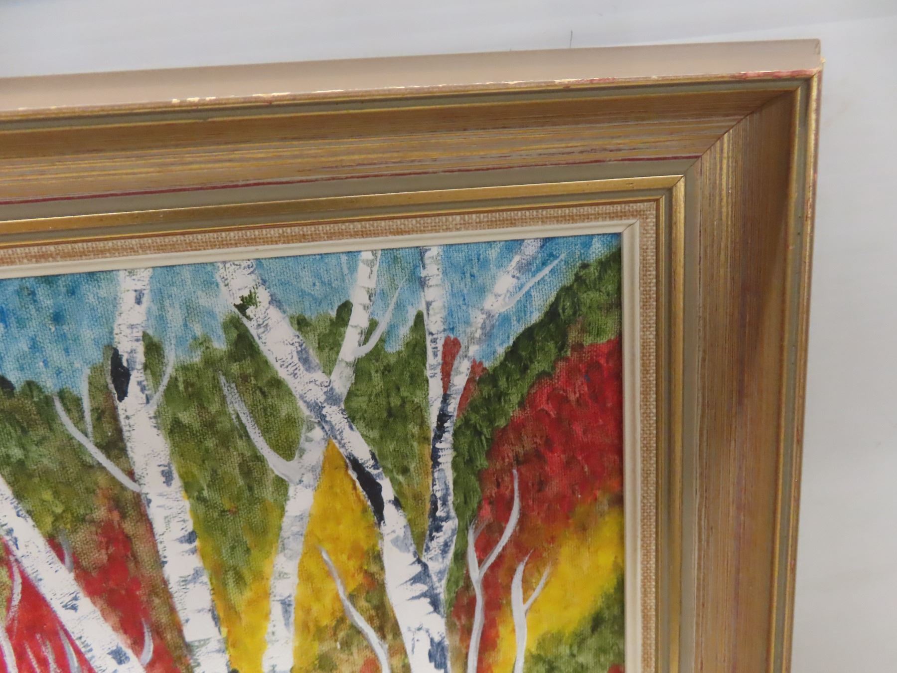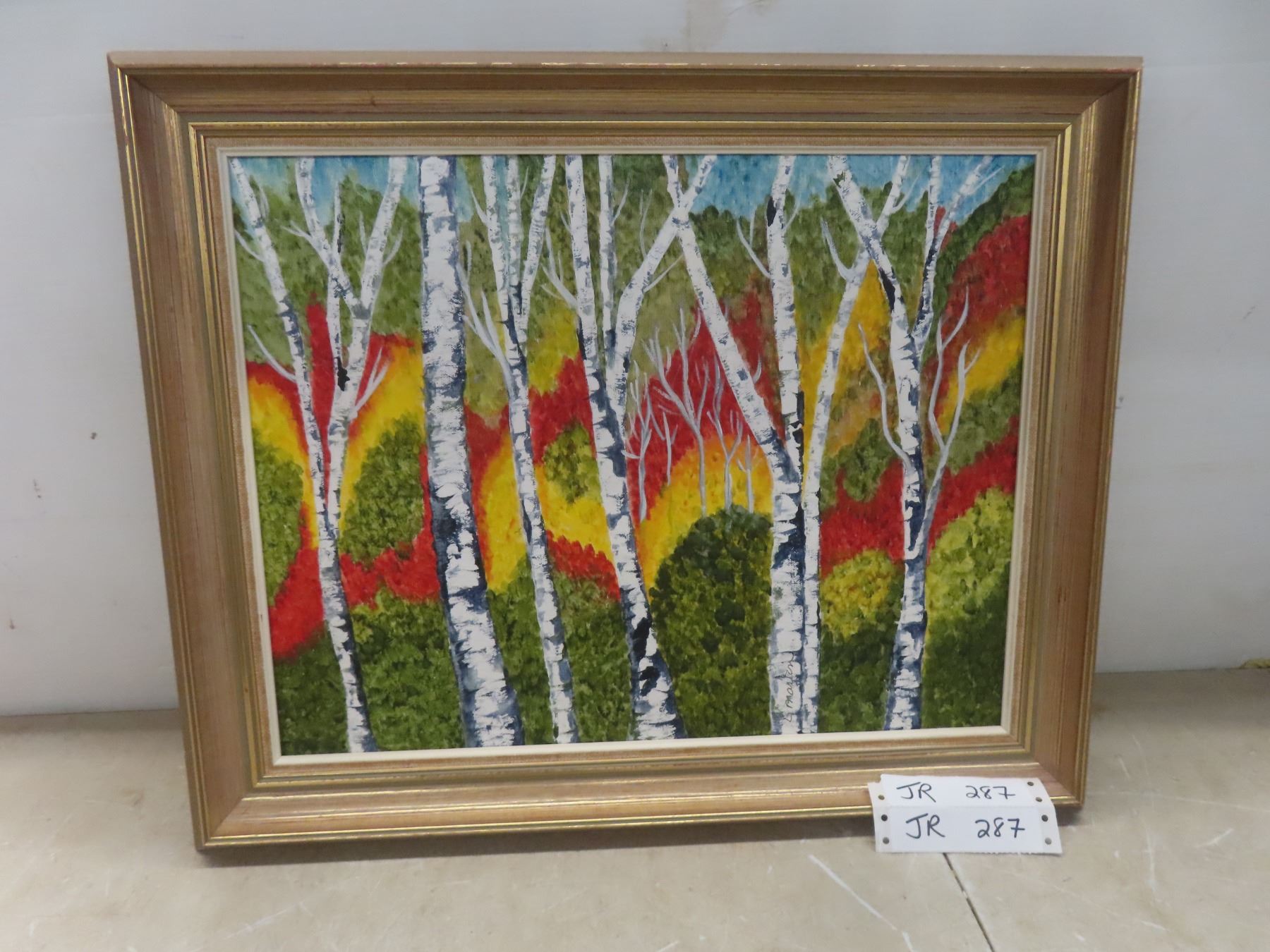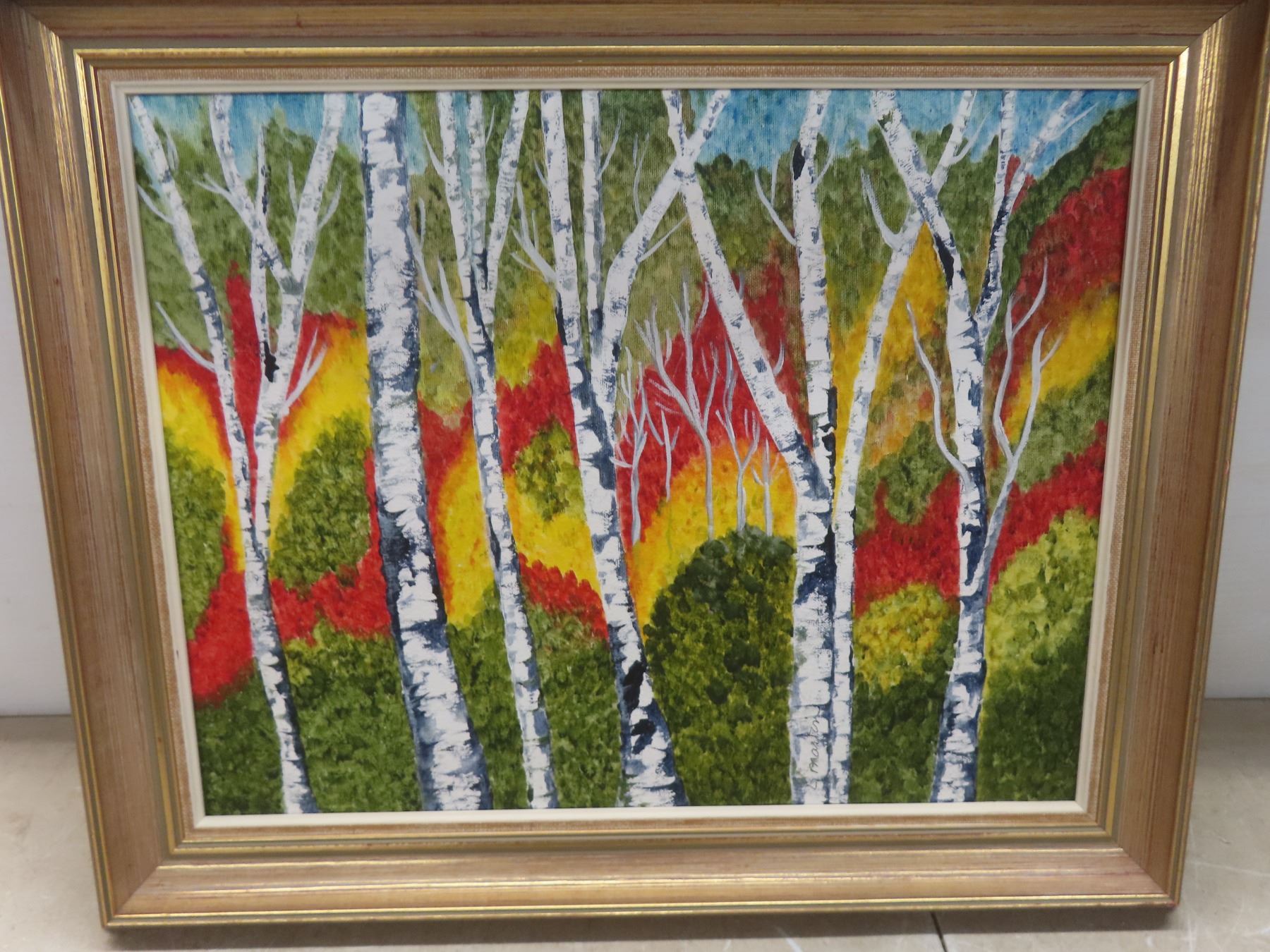Framed Oil on Canvas by Manitoba Artist L. Martin " Birch Trees + Autumn Blaze" 21" x17"