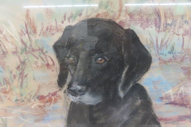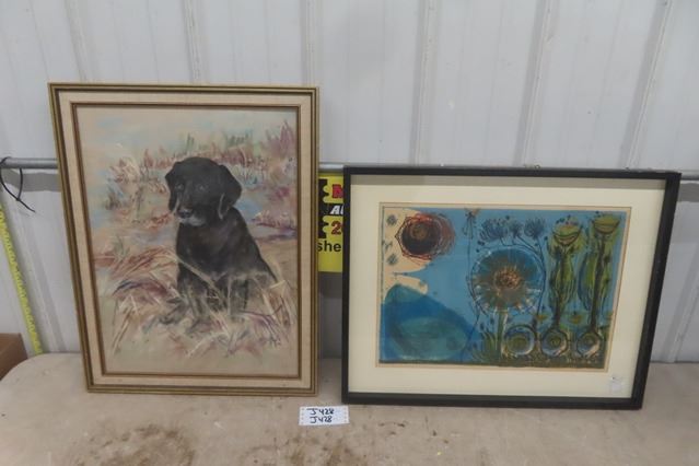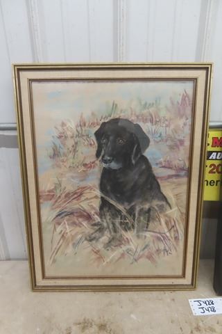 Framed Pastel Drawing of Dog 21"×27.5" + Vintage Framed Water Color 21"×27"