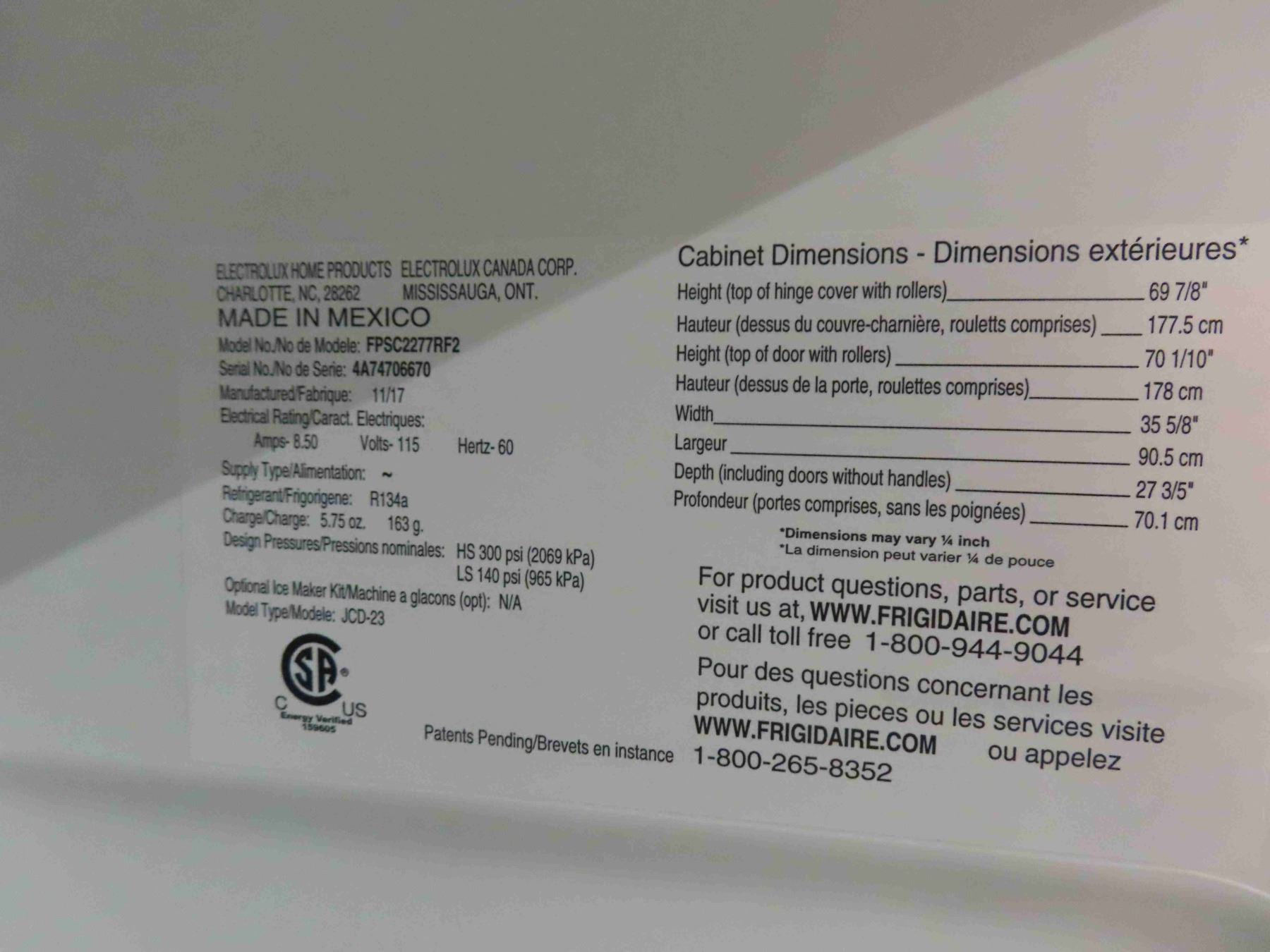 Frigidaire Professional 36" Refrigerator/ Freezer Model FPSC2277RF2 Stainless Steel 28"d by 36"w by 69 7/8"