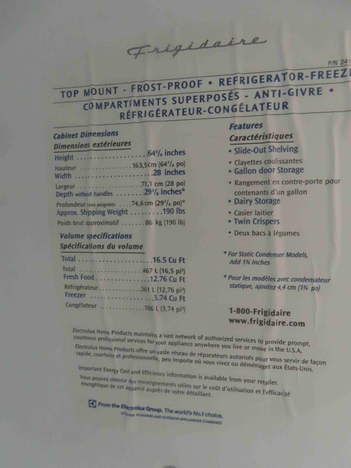 Frigidaire Upright Fridge with Top Freezer 65'' x 28 1/2'' x 29''