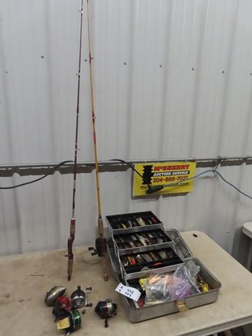 Full Fishing Rackle Box, Vintage Tackle Box, 2 Old Rods & 6 Reels