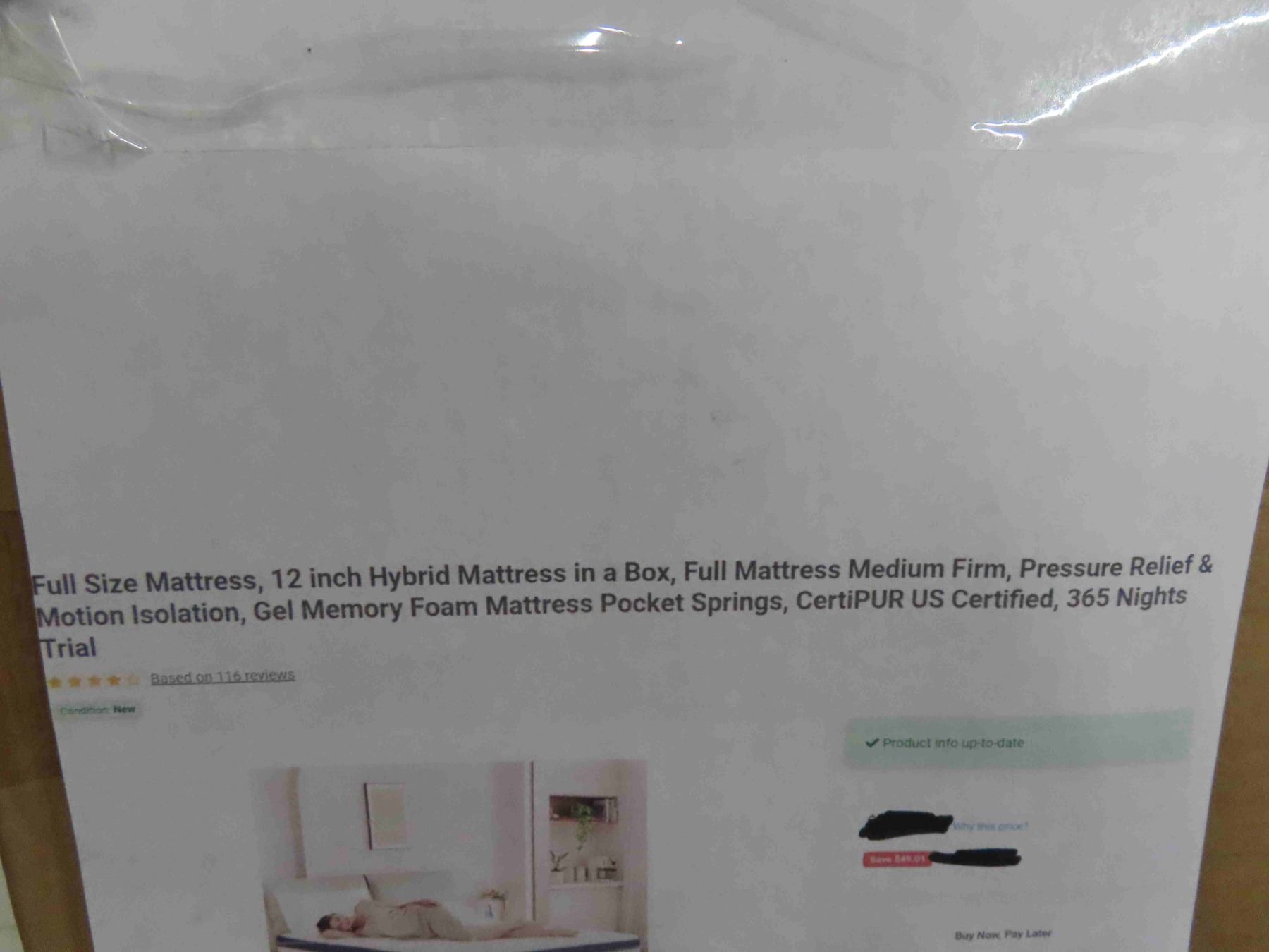 Full Size Mattress 12'' Hybrid Mattress ina Box Full Mattress Medium Firm Pressure Relief & Motion Isolation, Gel Memory Foam with Pocket Springs , CentiPUR U.S. Certified, 365 Nights Trial - New or Store Return