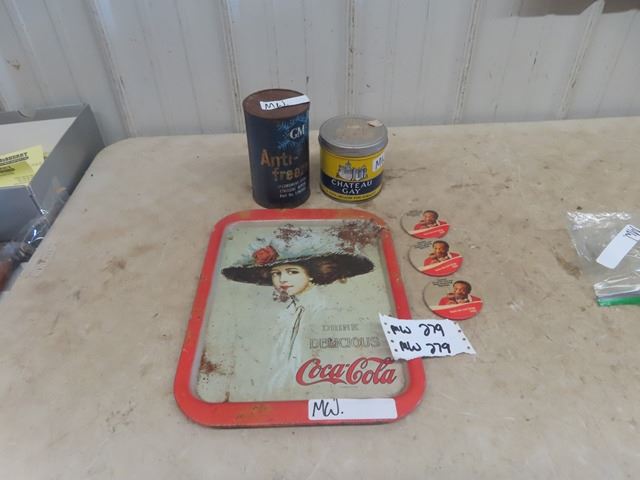 GM Antifreeze Quart Can, Tobacco Tin, Coke Tray, 3 Coke Buttons with that dirty old man
