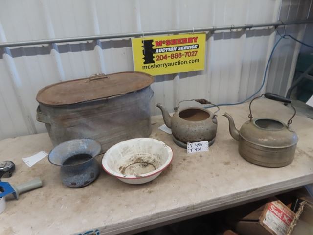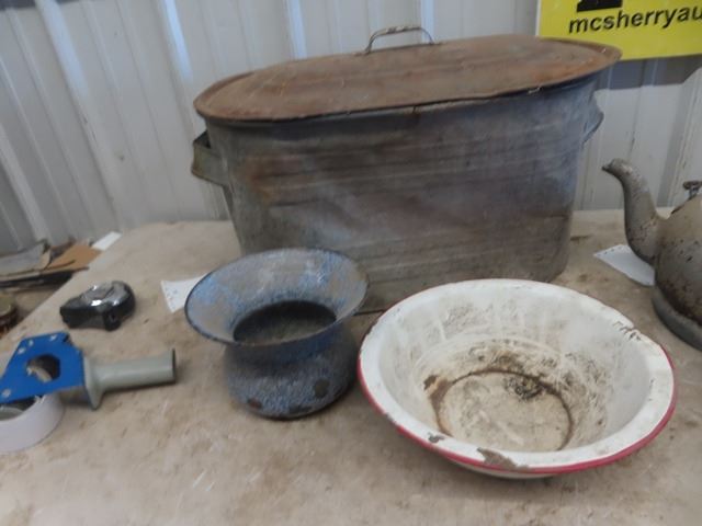 Galvanized Boiler with Lid, Graniteware, Spatton, 2 Aluminum Kettles