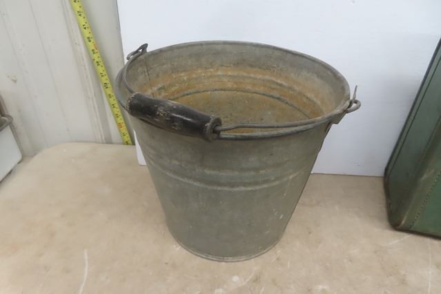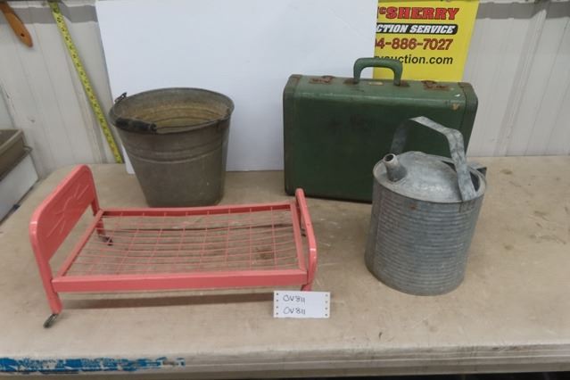 Galvanized Pail with Wooden Handle, Galvanized Watering Can, Metal Doll Bed, Small Vintage Suitcase