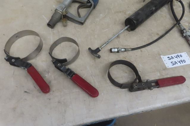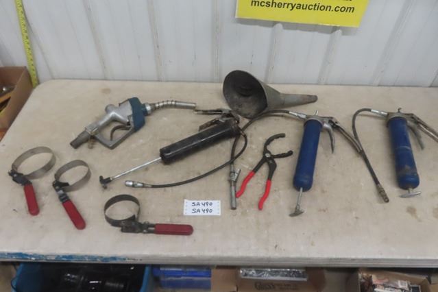 Gas Pump Nozzle, 3 Grease Guns, 4 Oil Filter Wrenches