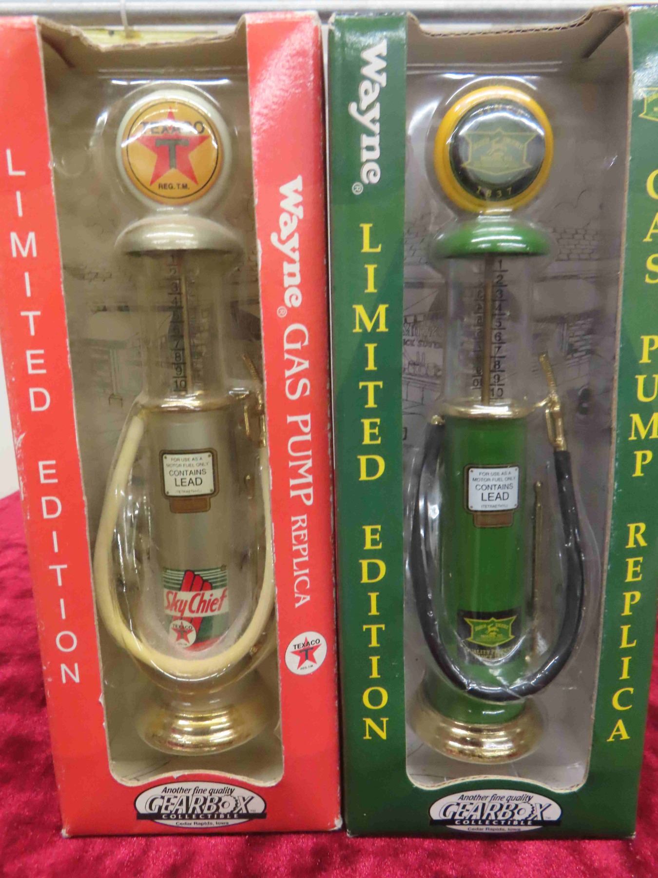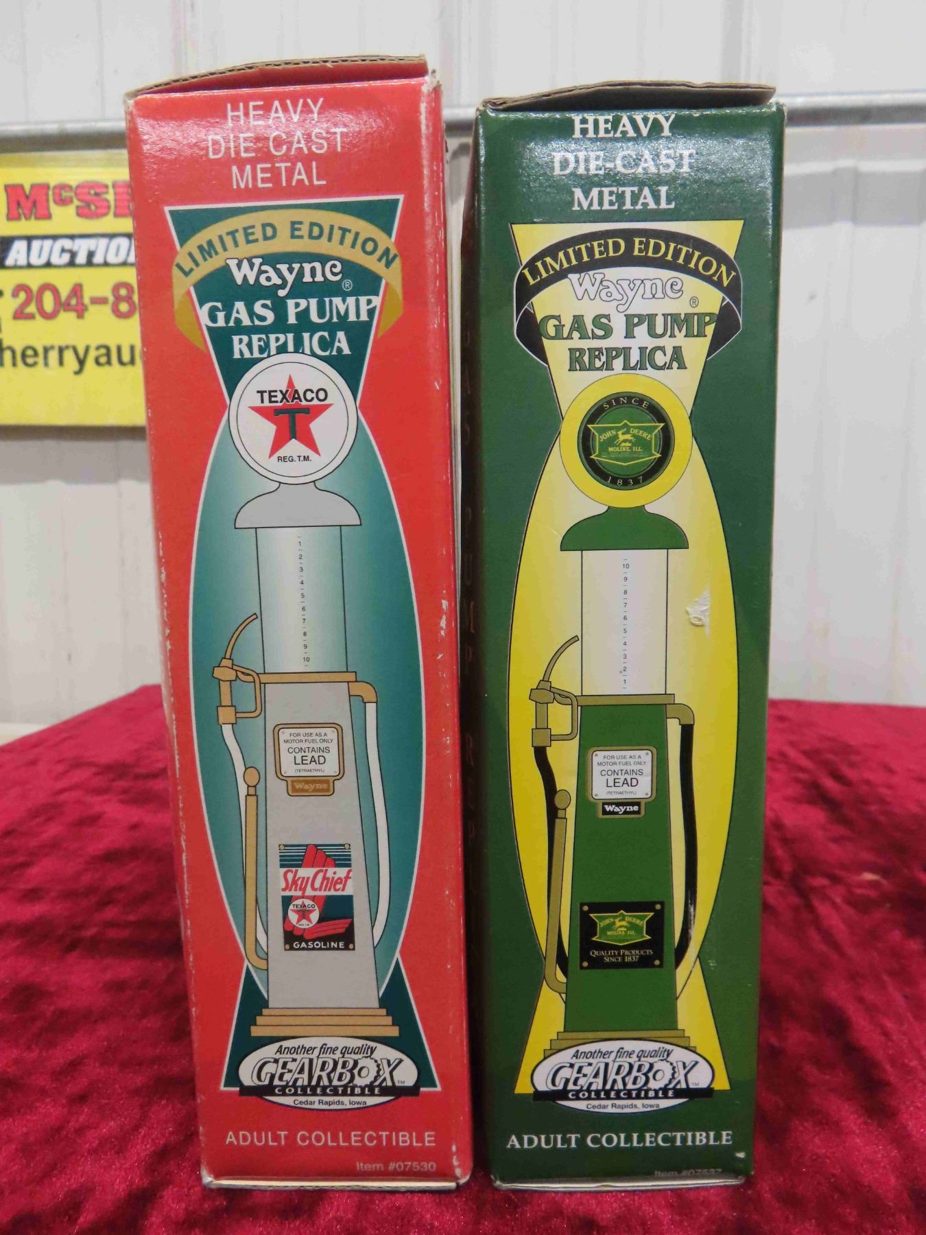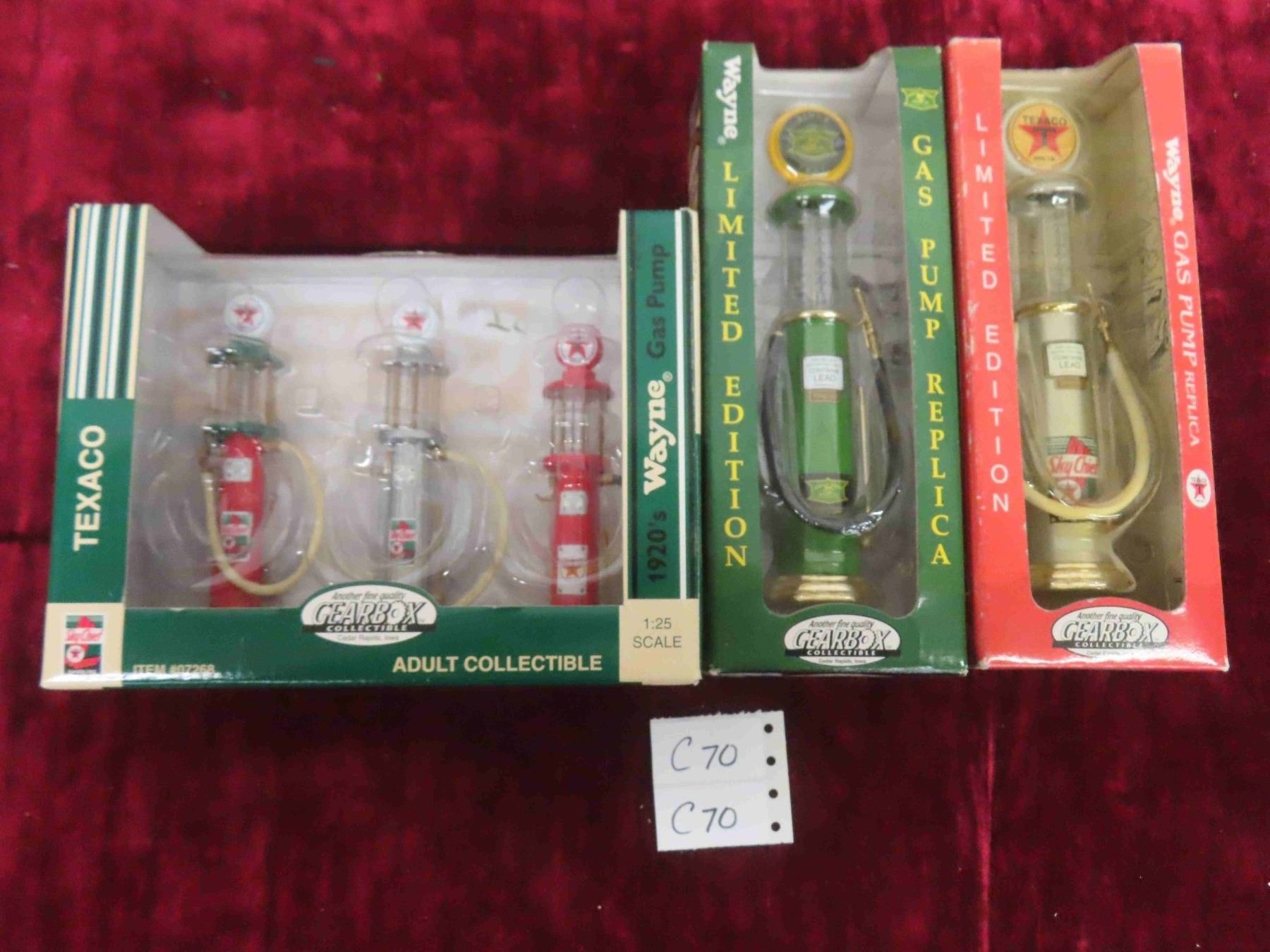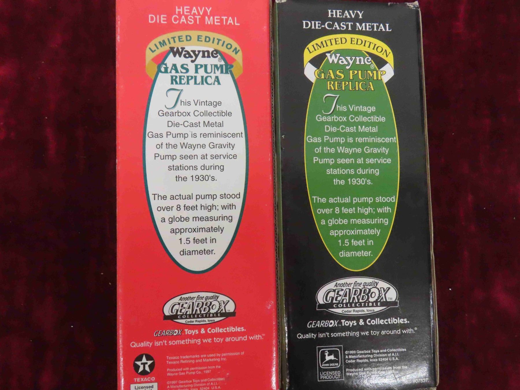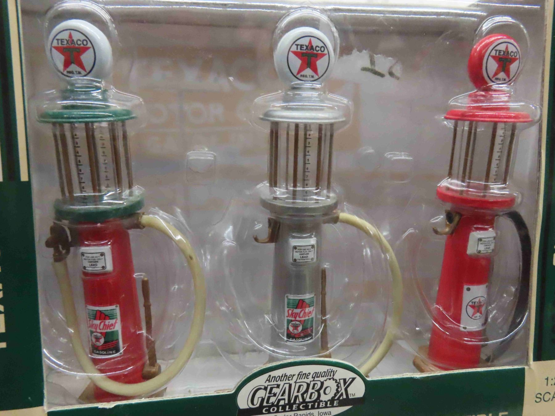 Gear Box Collectibles ; John Deere + Sky Chief Gas Pumps Die Cast Metal 2" x 7.75" 3 Pack 1:25 Scale Texaco, Sky Chief Gas Pumps in Original Package