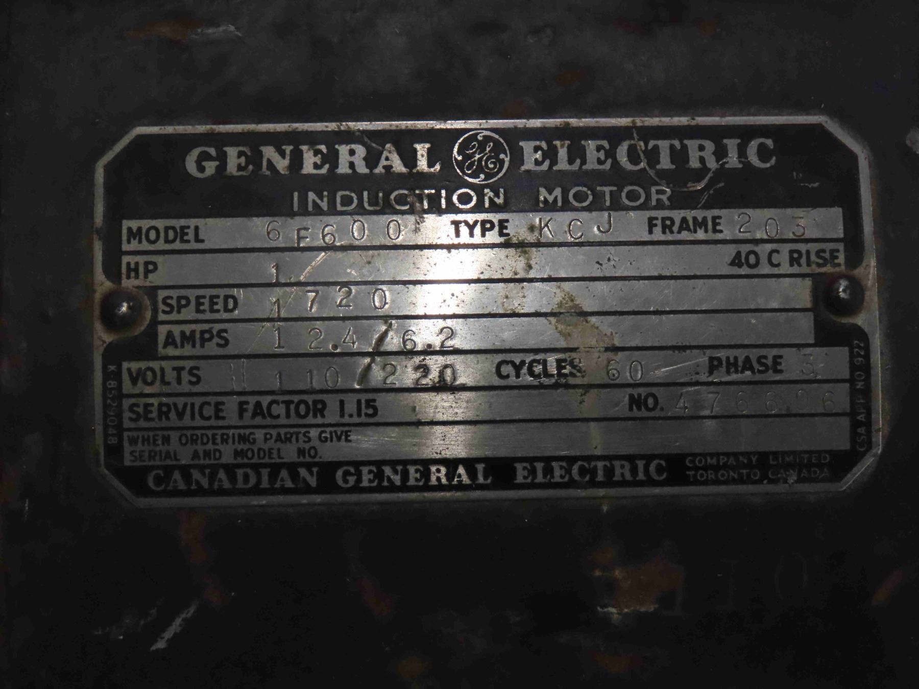 General Electric Model 6F600 1HP Electric Motor