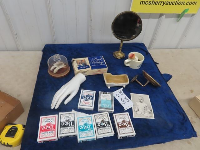 Gentleman's Shaving Mirror, Soap Dish, Mannican Hand, Casino Cards Plus