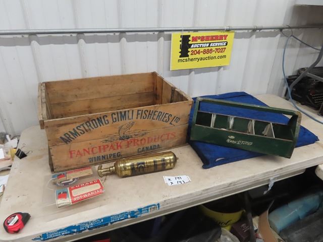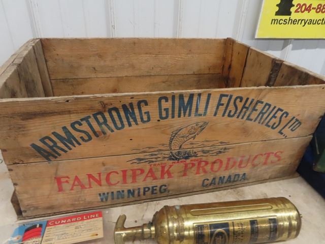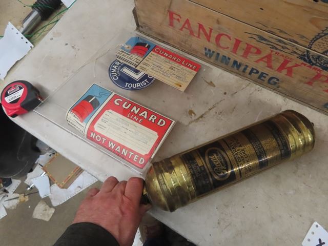 Gimli FIshing Crate, Brass Fire Extinguisher, Metal Tool Box, Cunard Passener Luggage Tags 1958