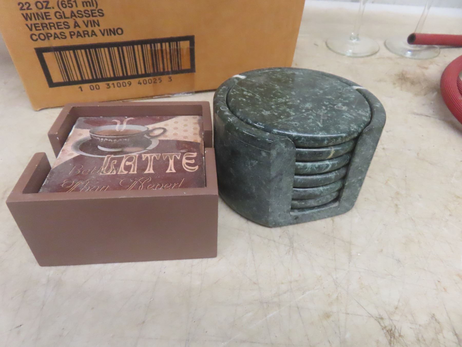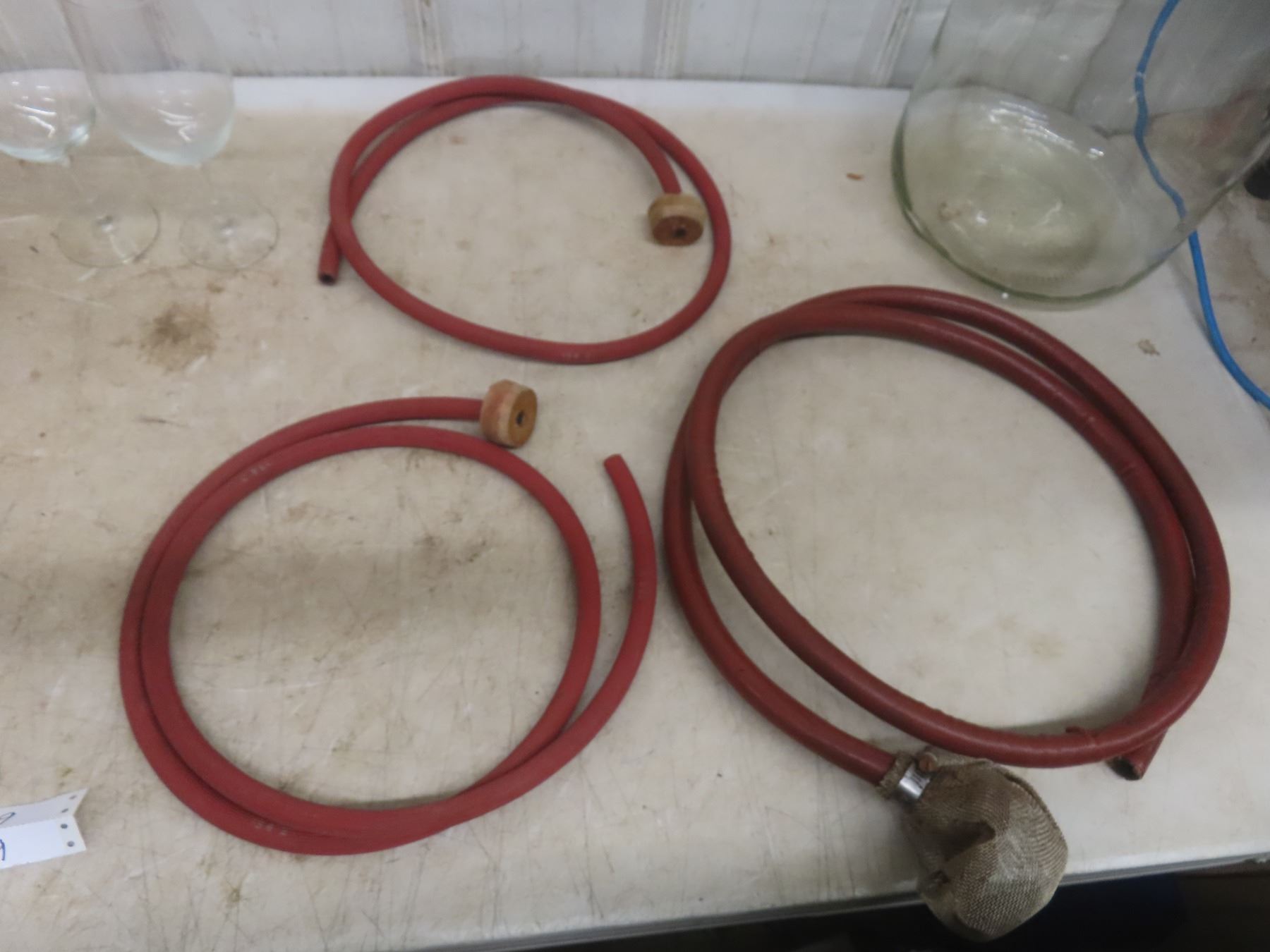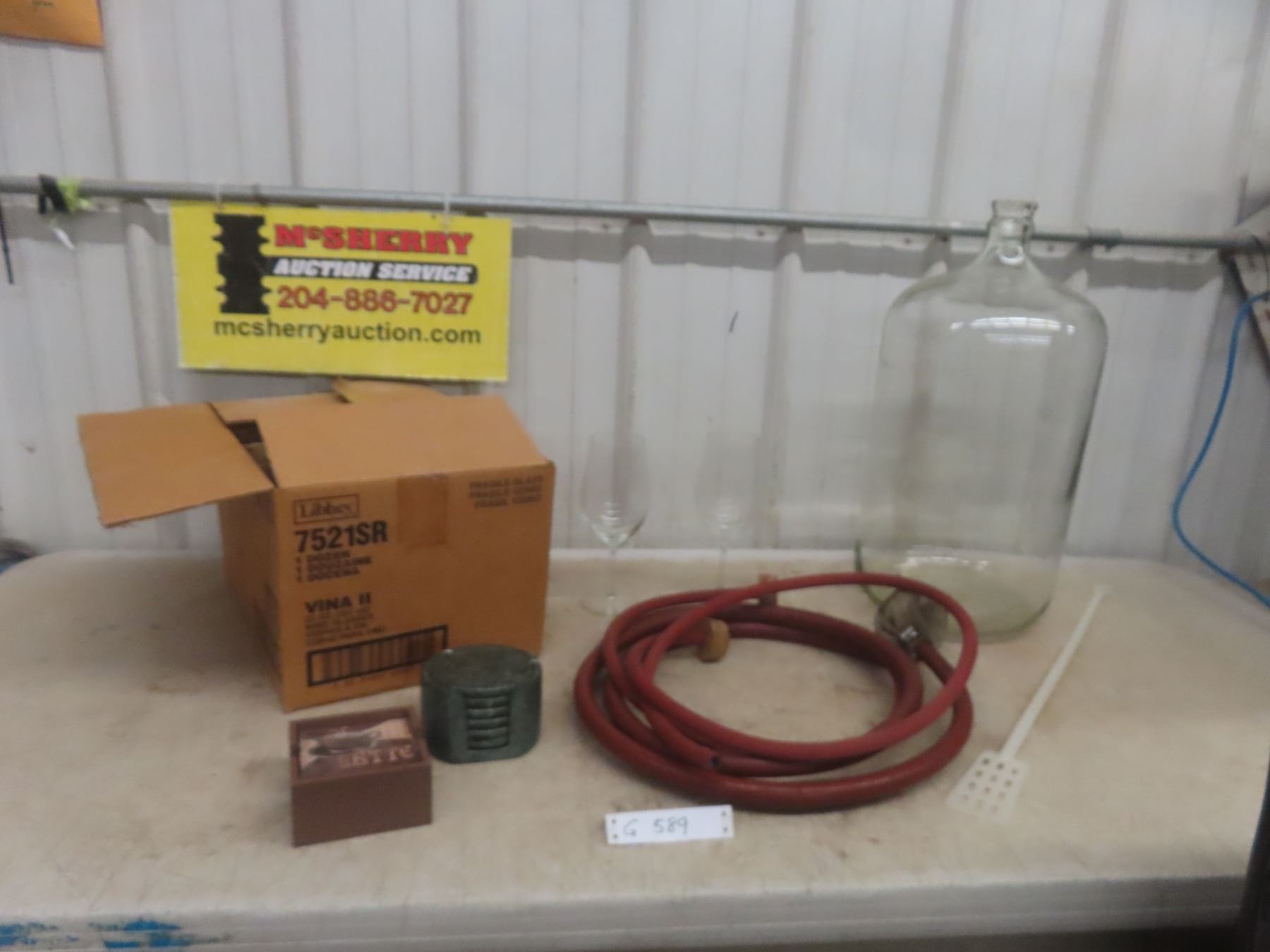 Glass Carboy, Hoses, Coasters and 12 New Wine Glasses