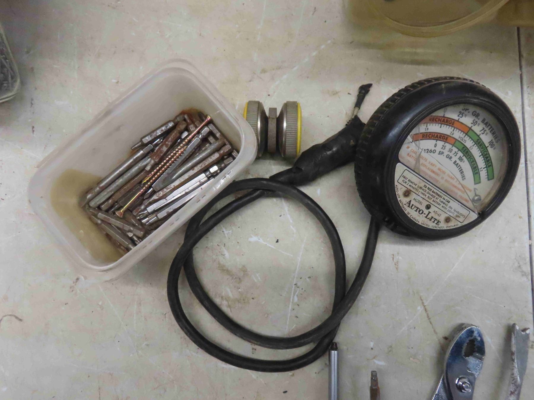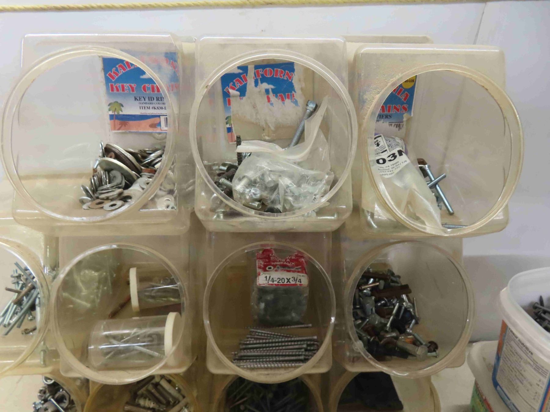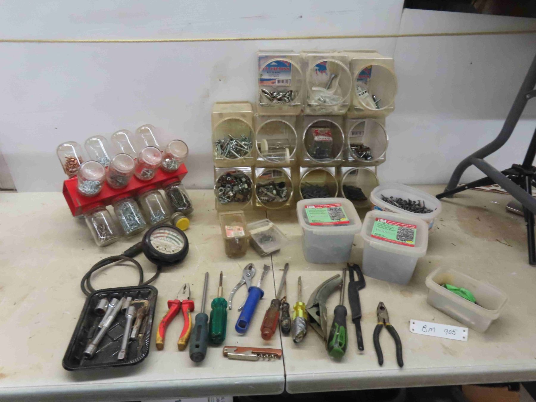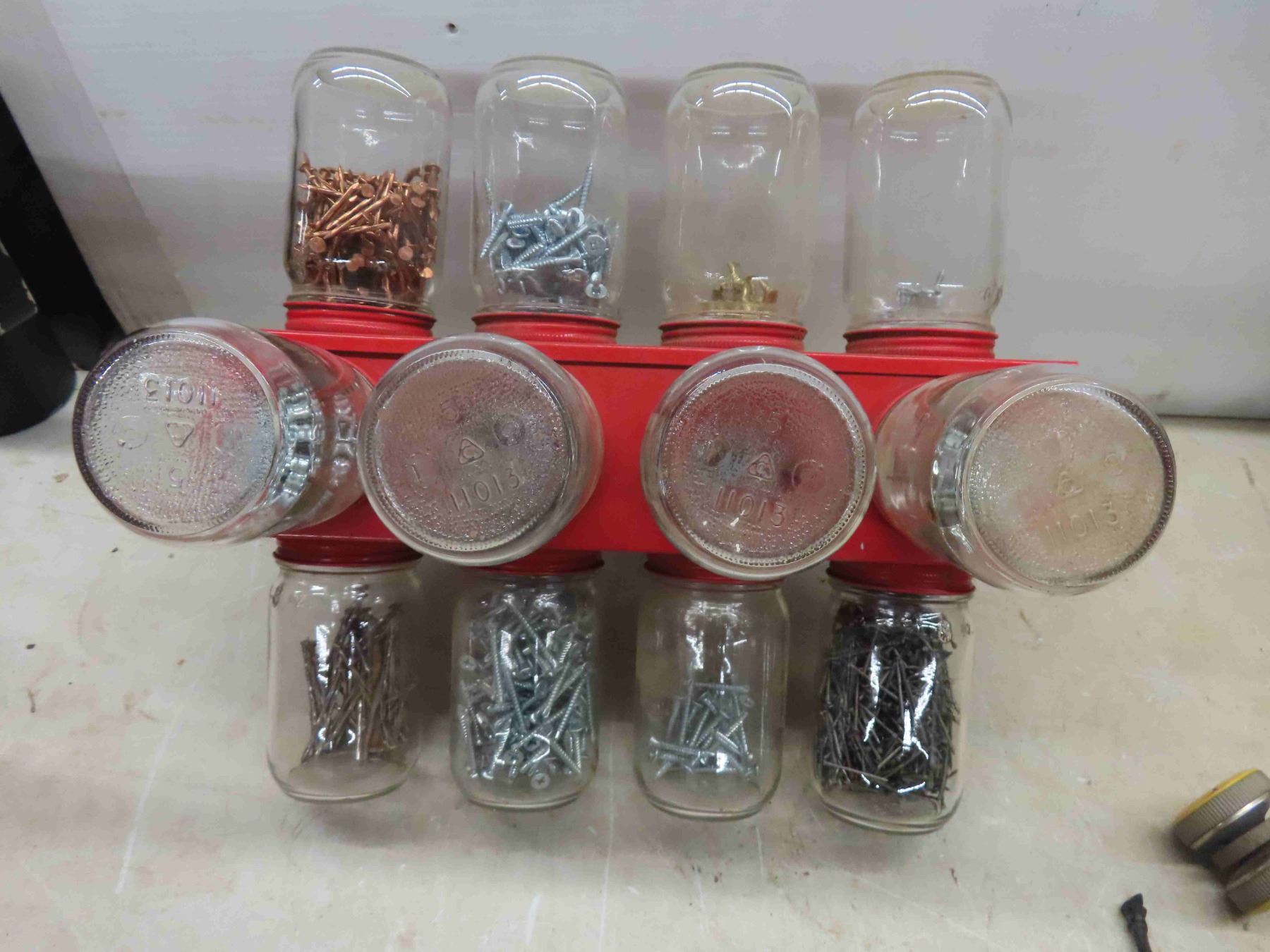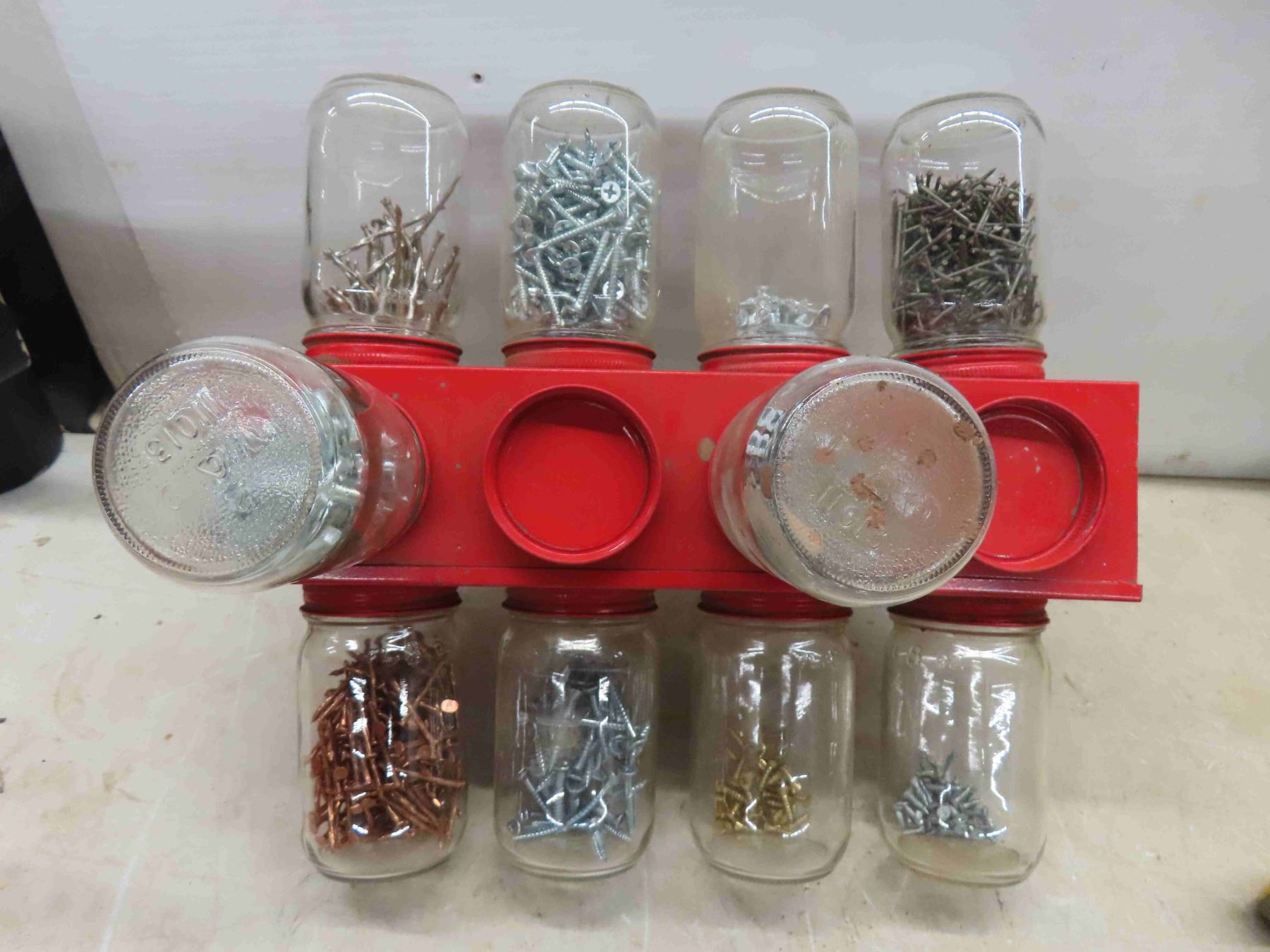 Glass Jar and Metal Organizer Bins of Fasteners, Nails, Screws, Washers, Nuts, Bolts & Hand Tools