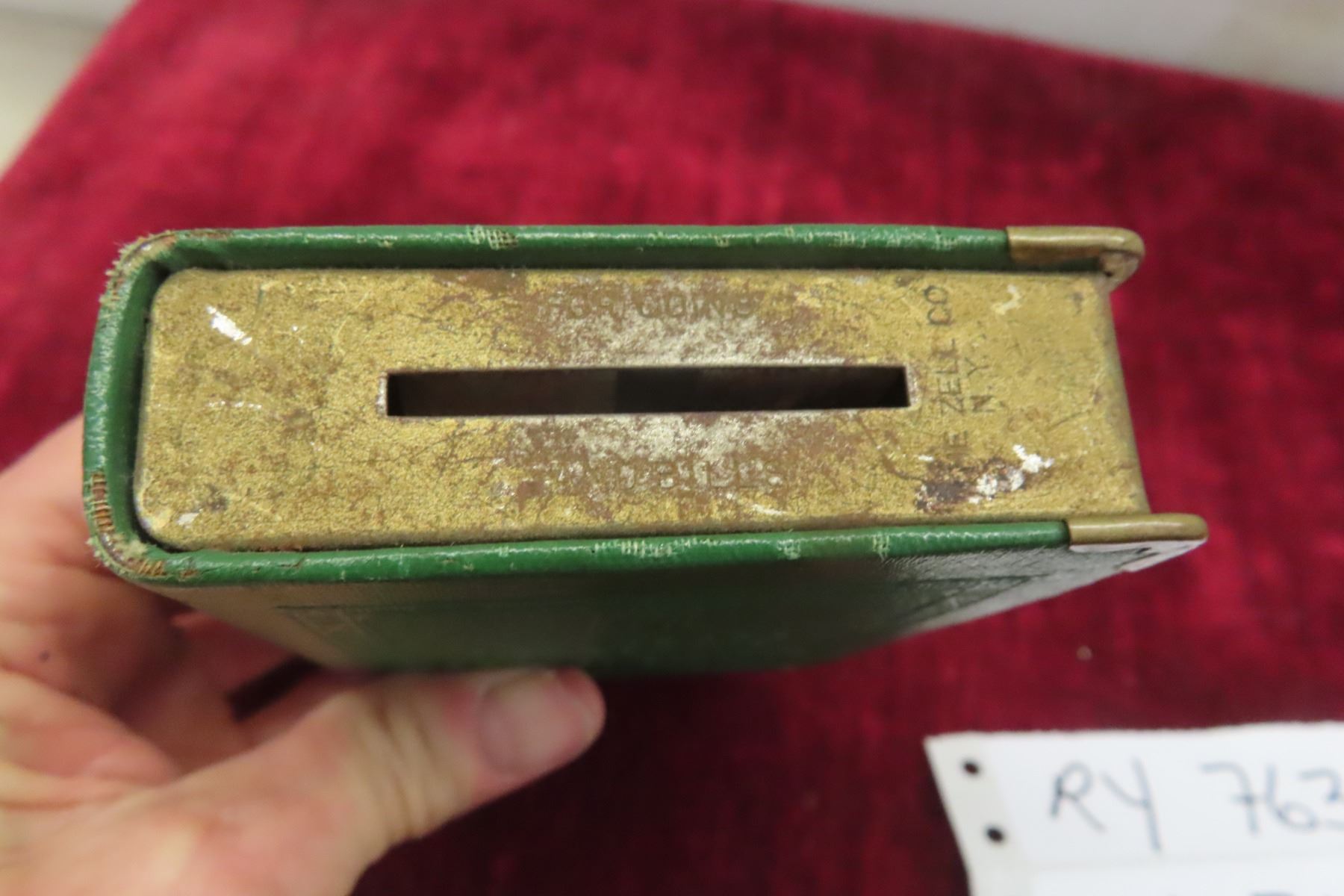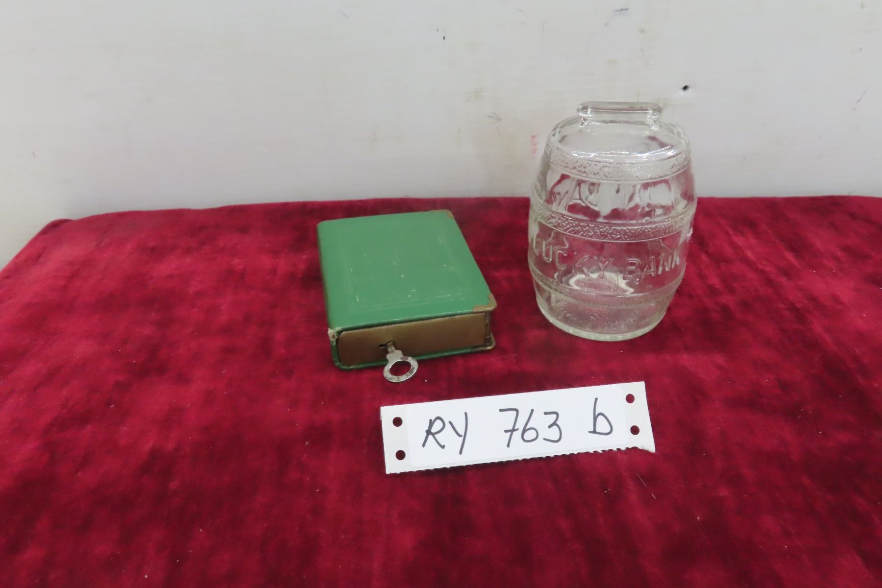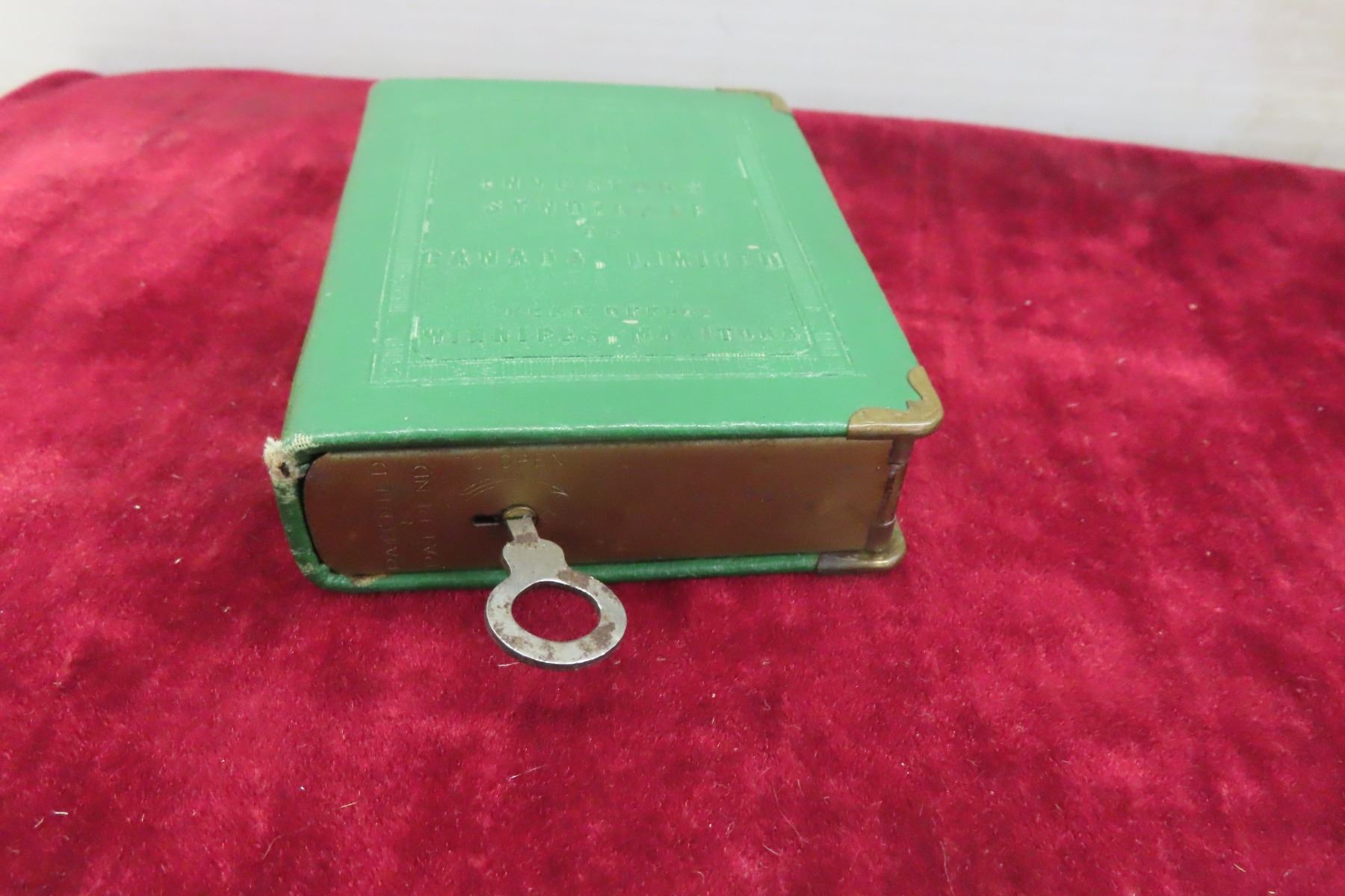 Glass Lucky Coin Bank 4 1/2'' H Investors Syndicate Winnipeg Book Shaped Metal Bank with Key