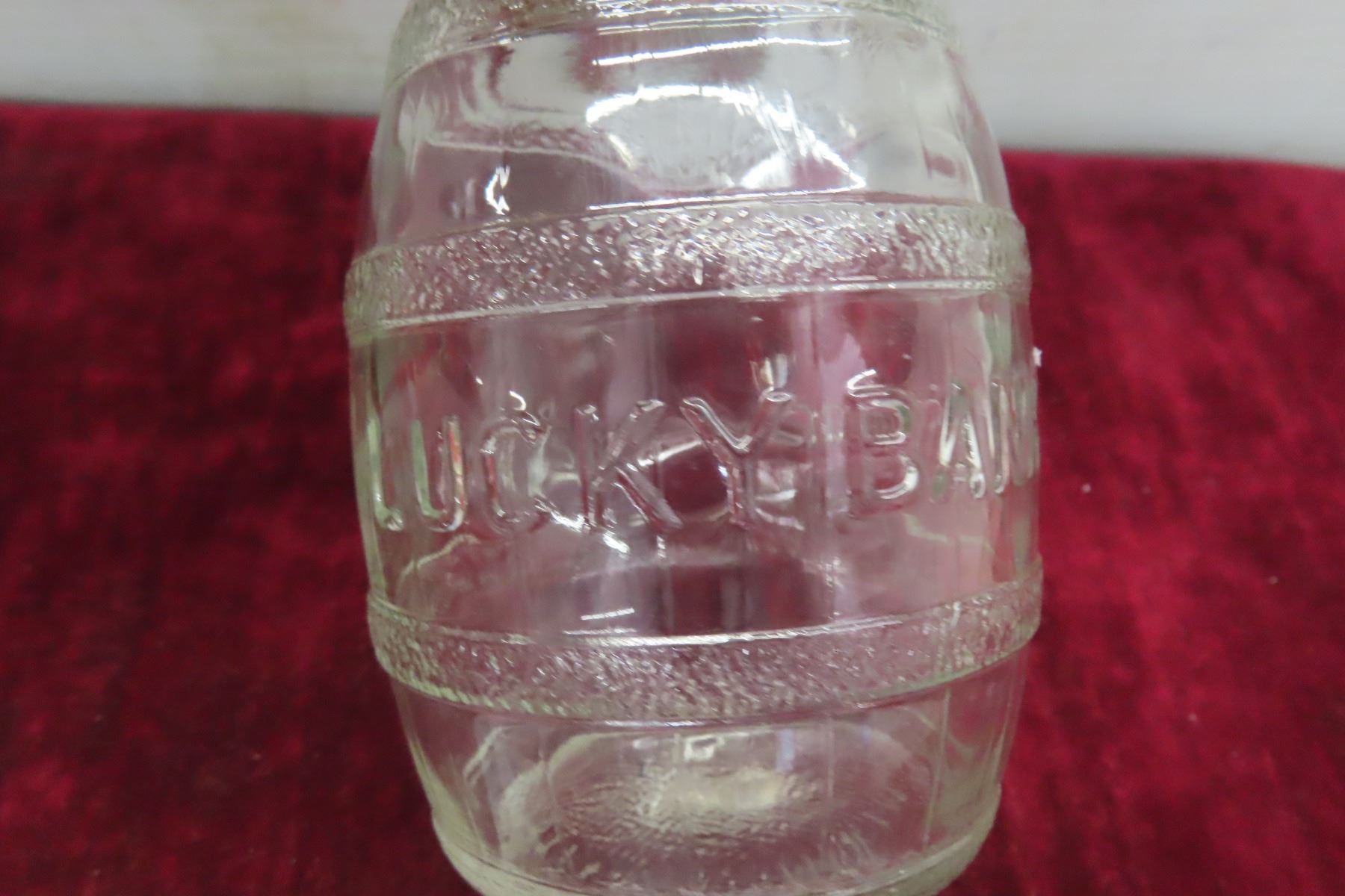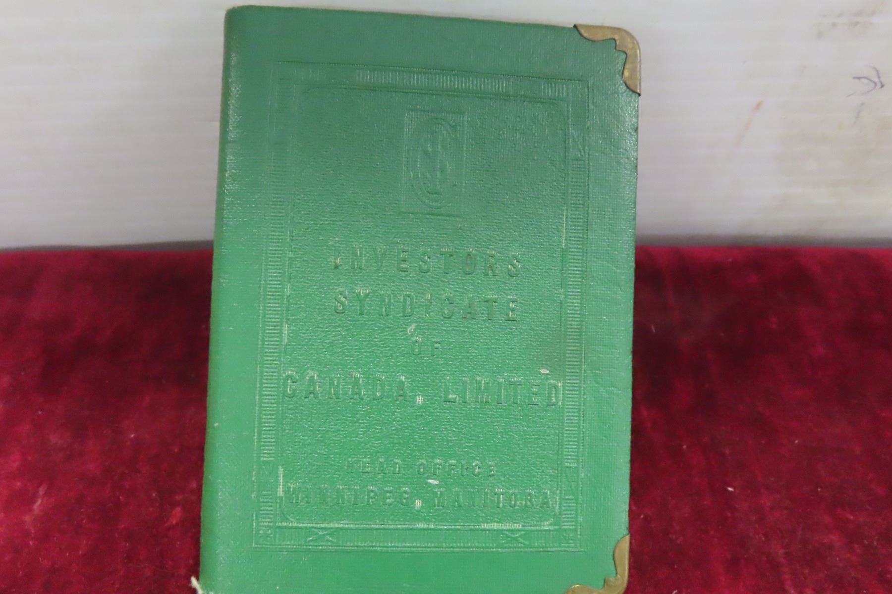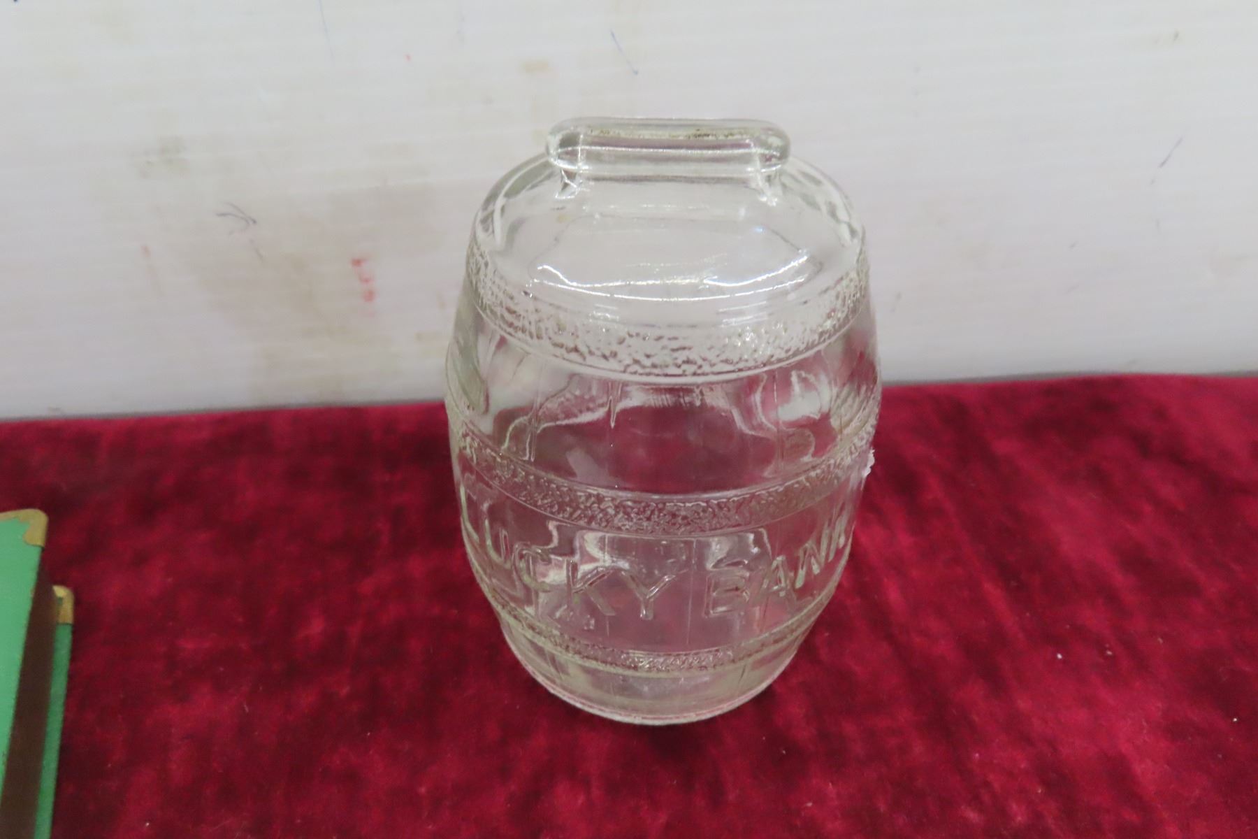 Glass Lucky Coin Bank 4 1/2'' H Investors Syndicate Winnipeg Book Shaped Metal Bank with Key