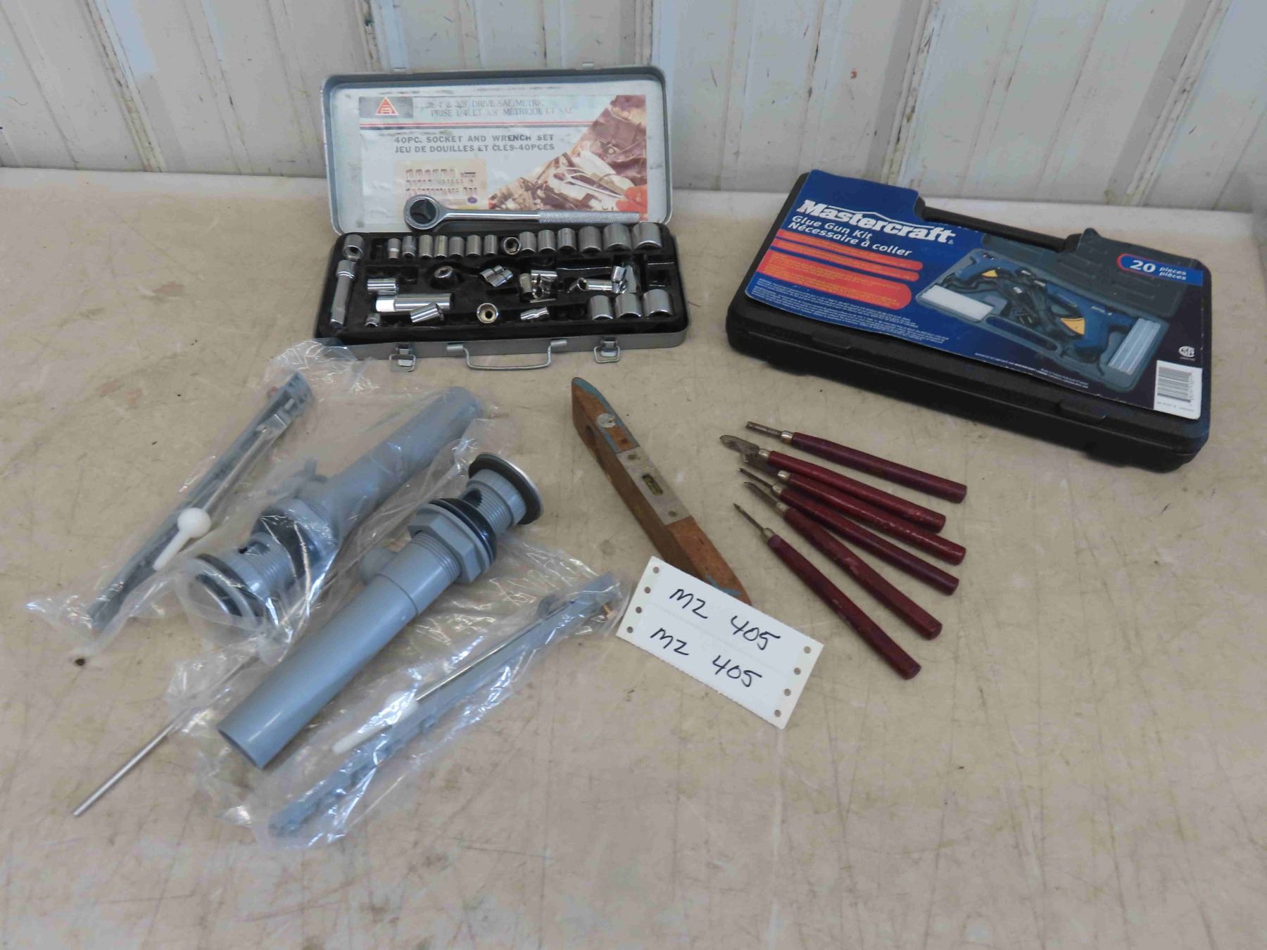 Glue Gun, Stanley Wood Level, Socket Set, Chisels, Plumbing Supplies