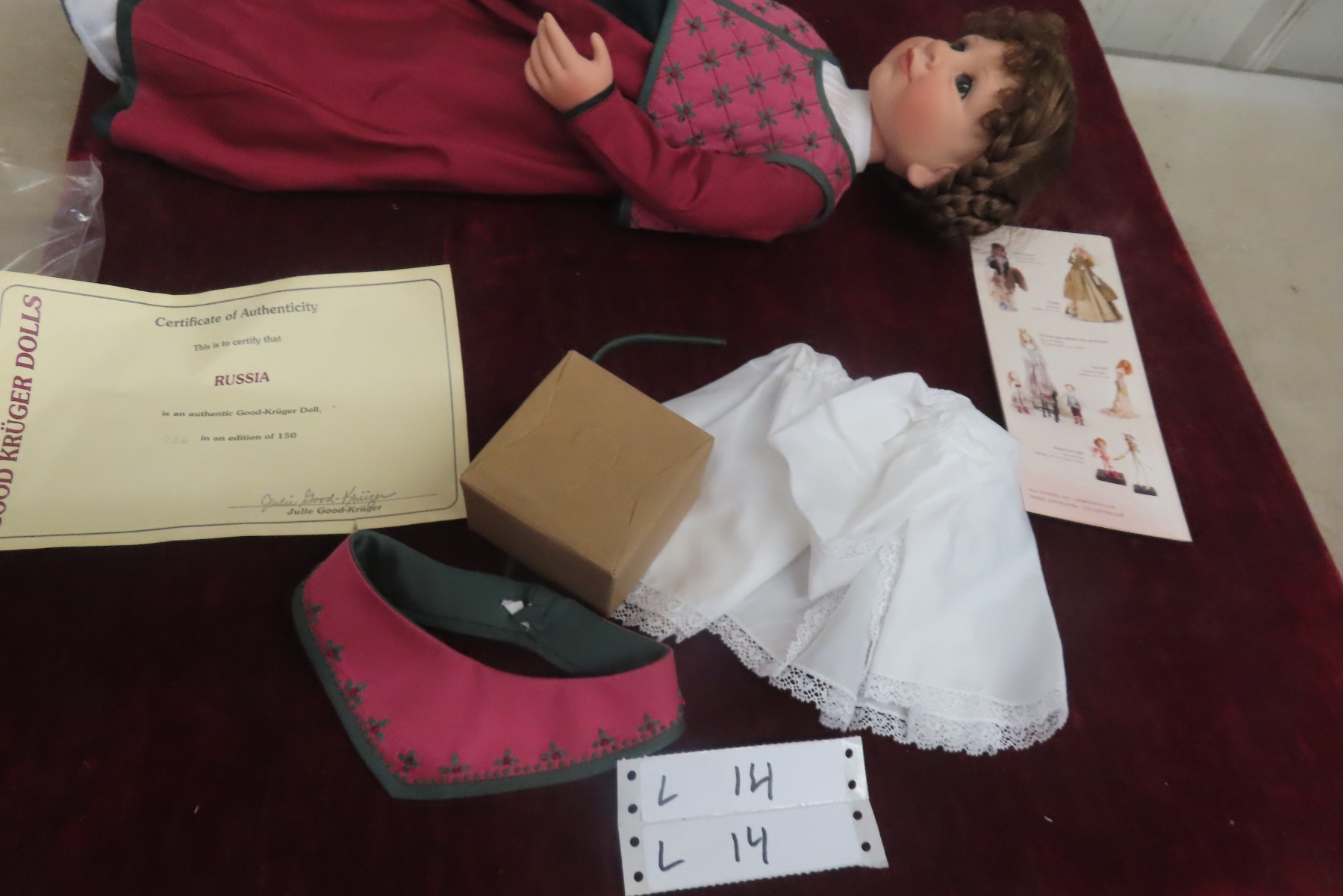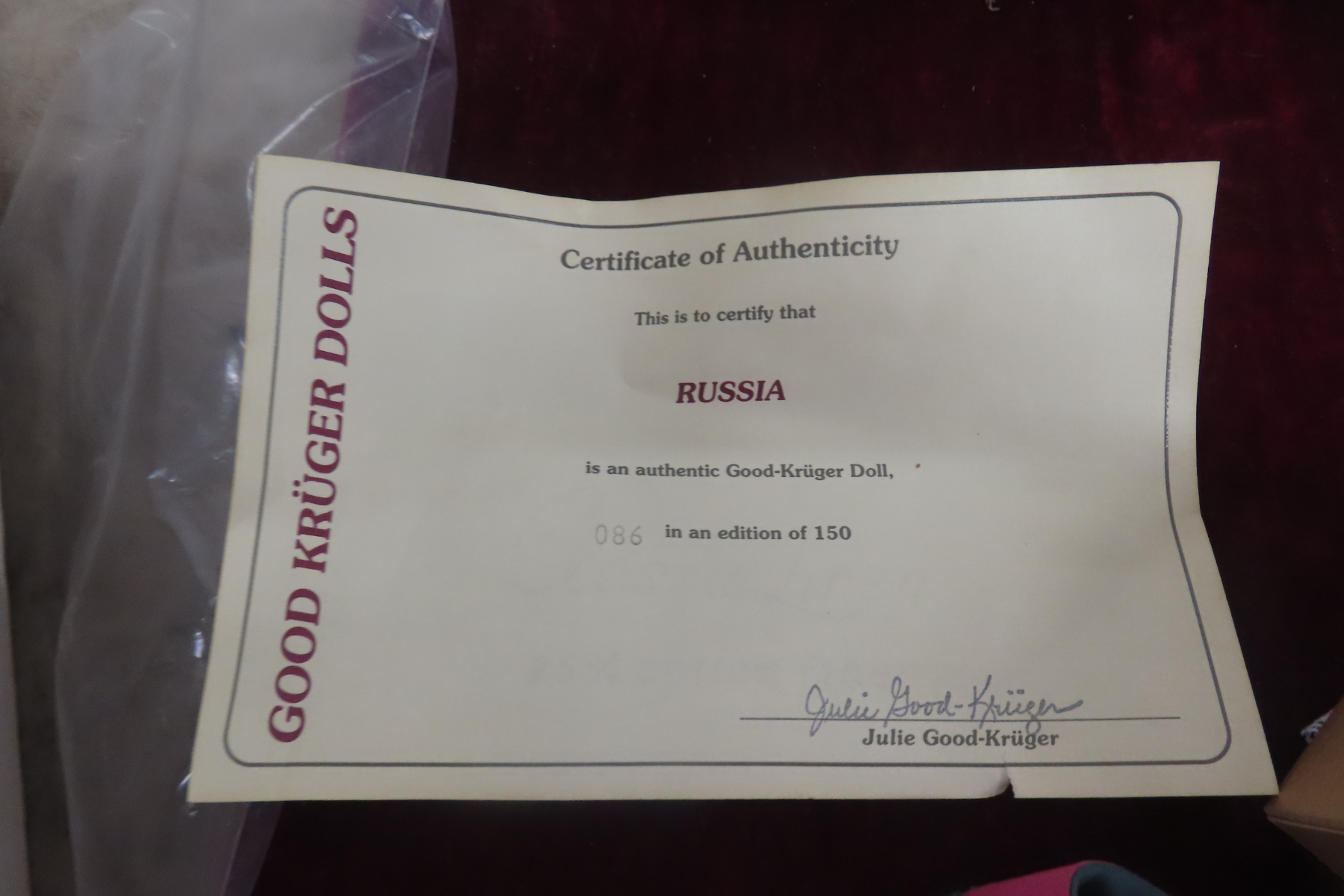 Good-Krüger “Russia” Limited Edition Vinyl Doll No. 086/150 — Includes Original Outfit, Embroidered Vest, Extra Garments, Painted Wooden Accessories, Certificate of Authenticity, and Original Box.