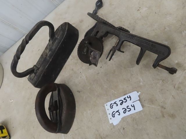 Goodell Co 1848 Apple Cider, & 2 Sad Irons , 1 HD & Carving Set