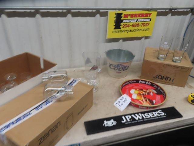 Grain Belt Metal Tray, Wisers Rip Mat, Coors Ice Bucket, 34 Beer Glasses, 12 Twisted Tea, 12 Cdn, 10