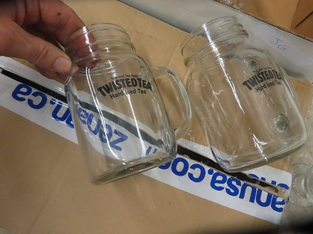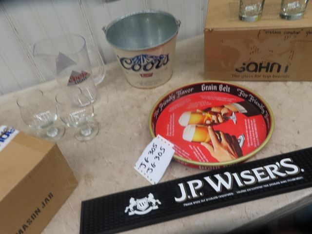Grain Belt Metal Tray, Wisers Rip Mat, Coors Ice Bucket, 34 Beer Glasses, 12 Twisted Tea, 12 Cdn, 10 Little Brown Jug