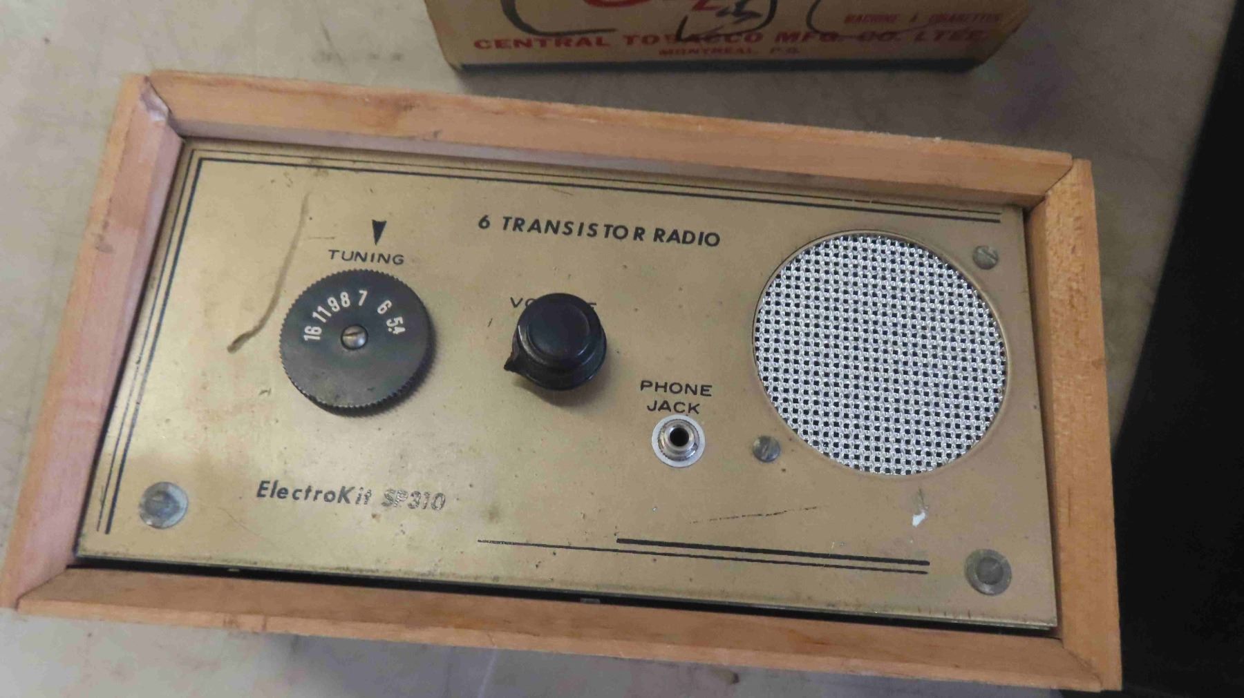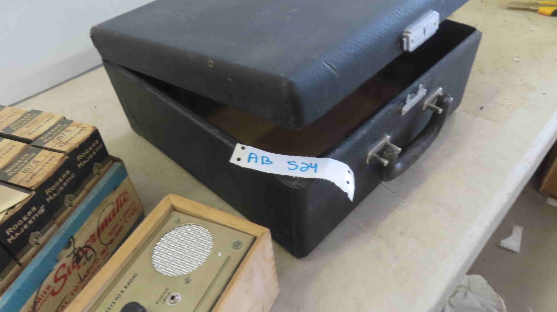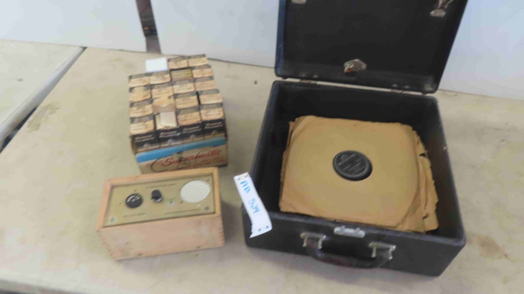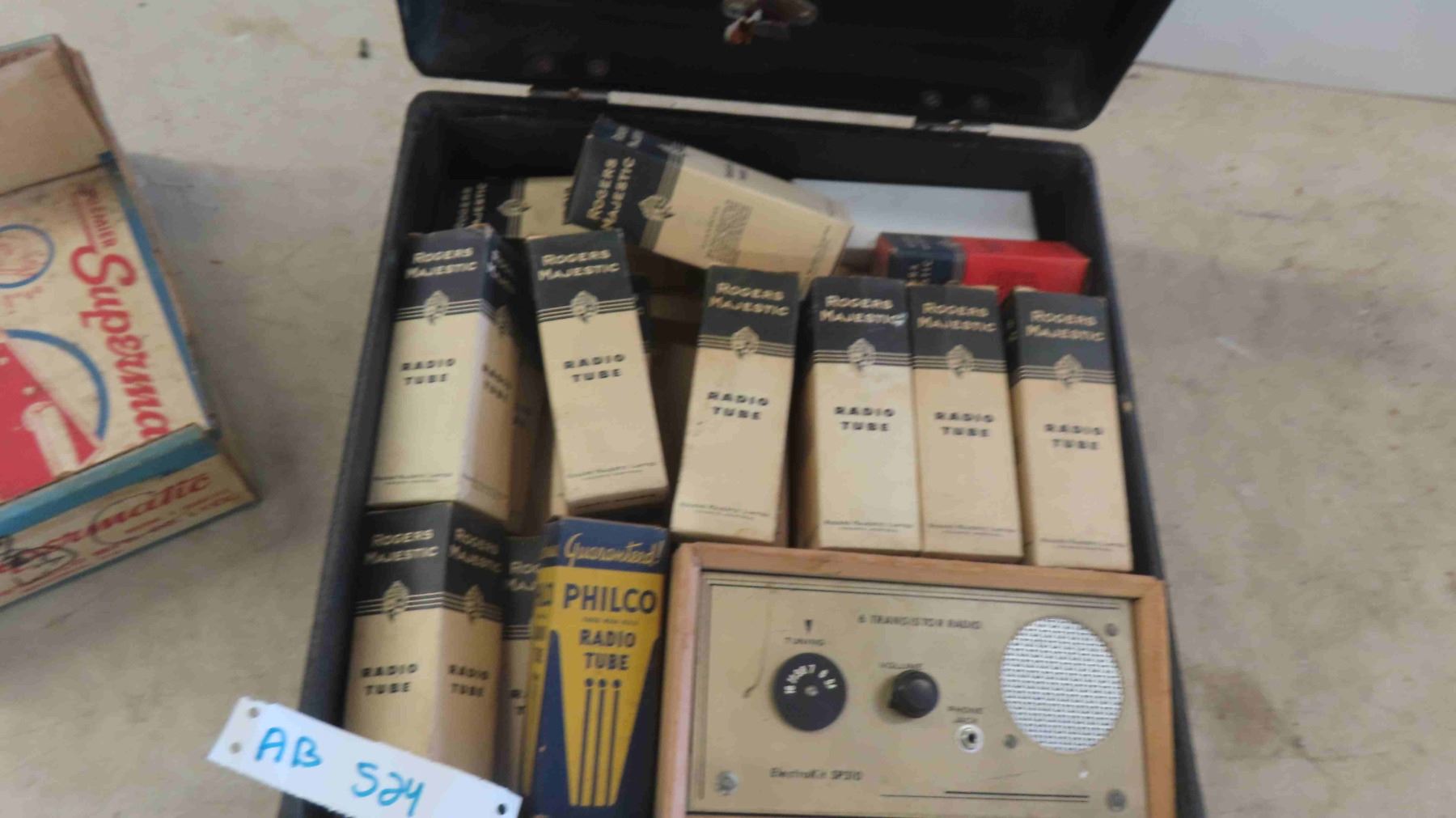 Gramophone Records with Case, 20 New Old Stock Radio Tubes, Transistor Radio