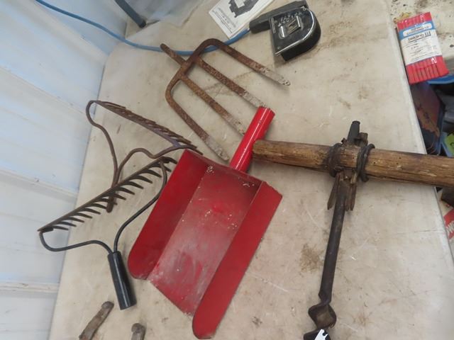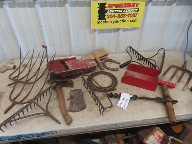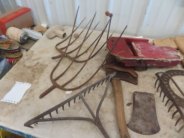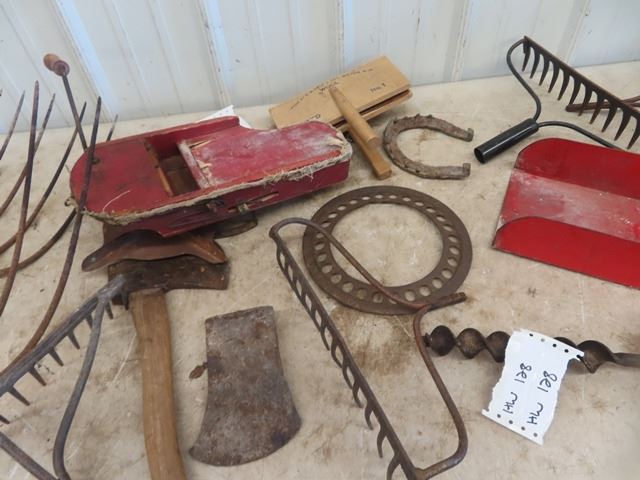 Grass Seed Broadcaster, Wool Carding Paddles, Auger Bits, Hatchet, Yard Tool Ends